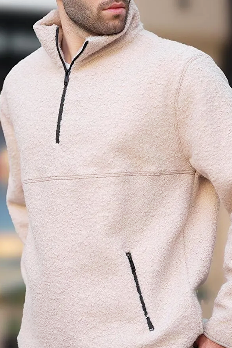 - Férfi polár pulóver cipzáras gallérral és zsebekkel bézs színben.