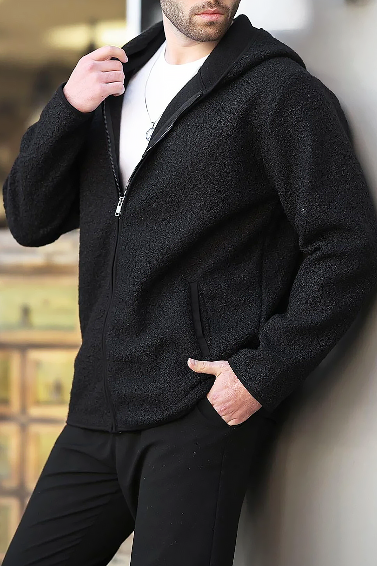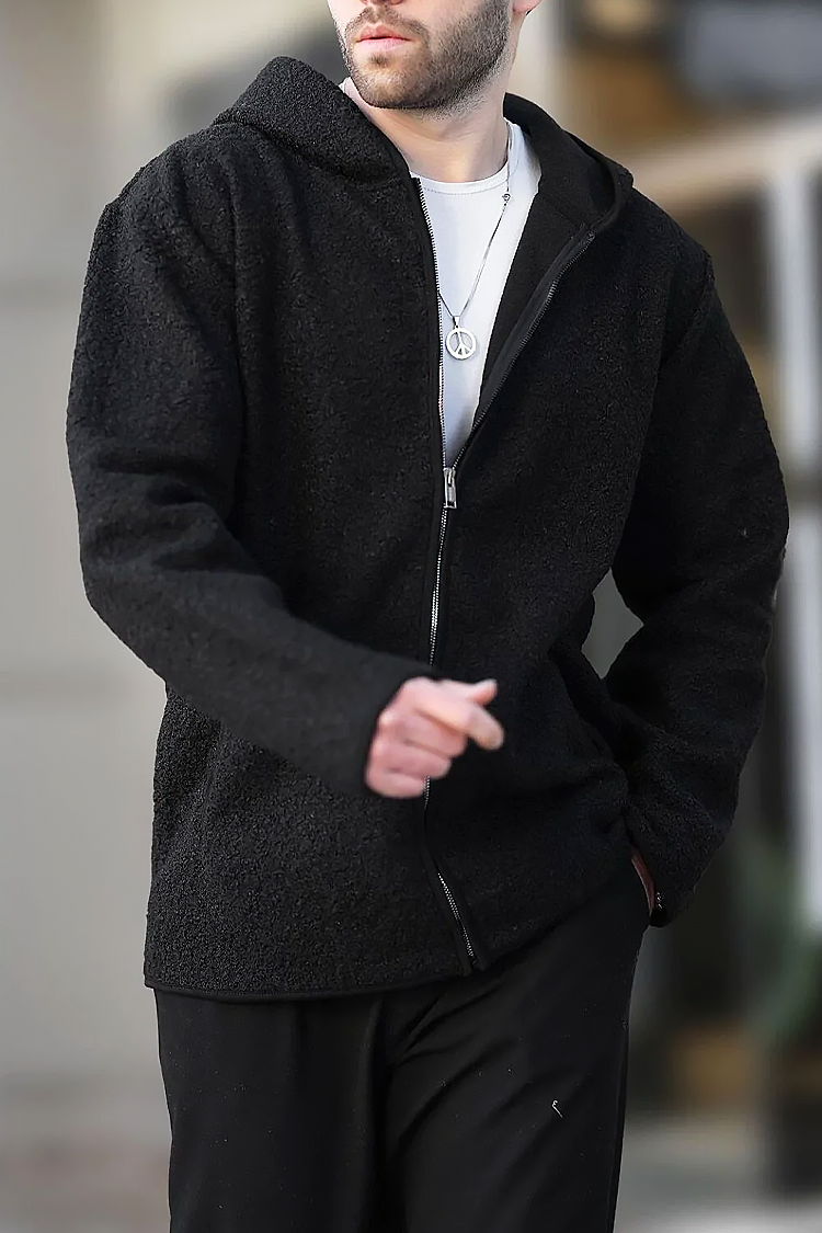 - Univerzális férfi kardigán kapucnival és cipzárral, puha polár anyagból, klasszikus fekete színben.