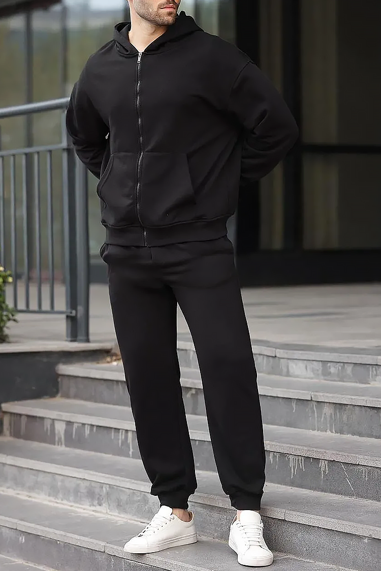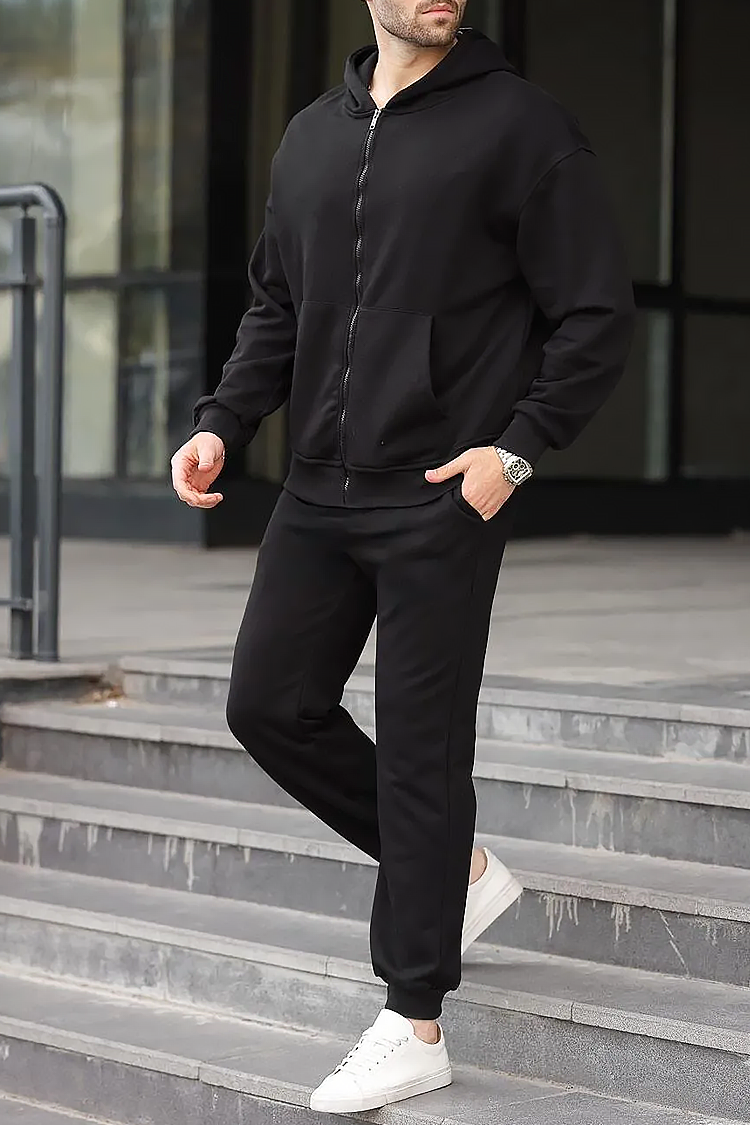 - Kényelmes, kétrészes sportos szett, amely egy kapucnis kardigánból és egy fekete színű, zsebes nadrágból áll.