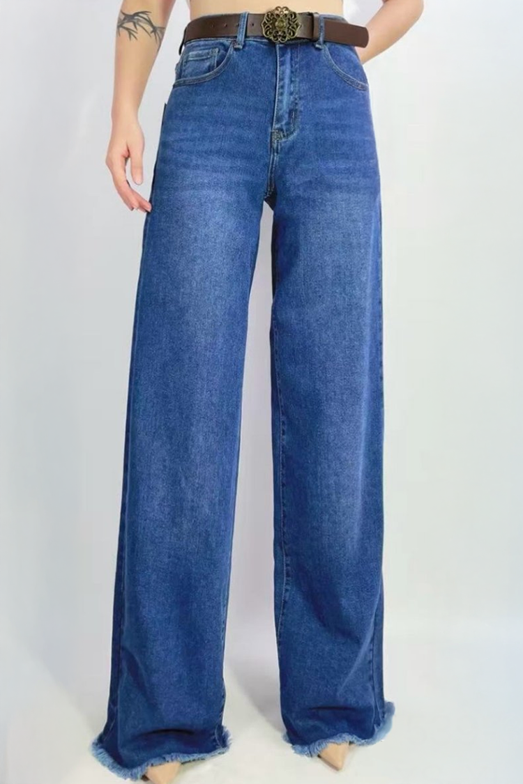 - A modell magas derekú, széles szárú, oldalsó zsebekkel és vonzó övvel rendelkezik.