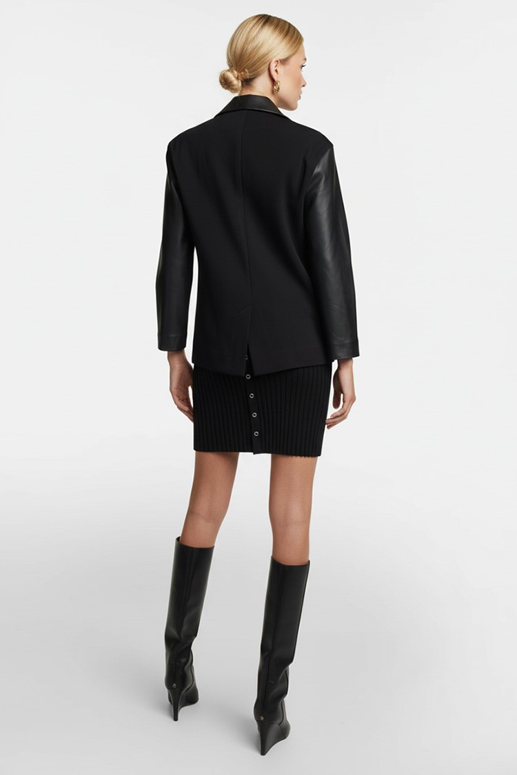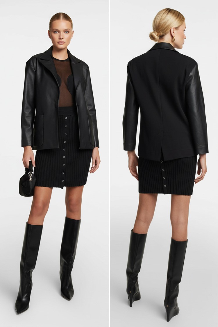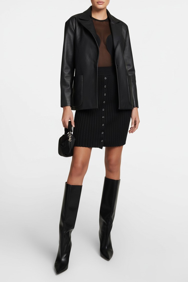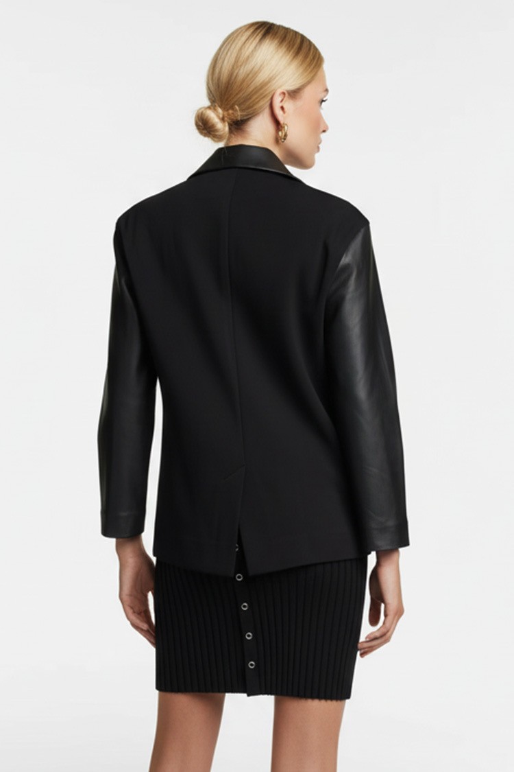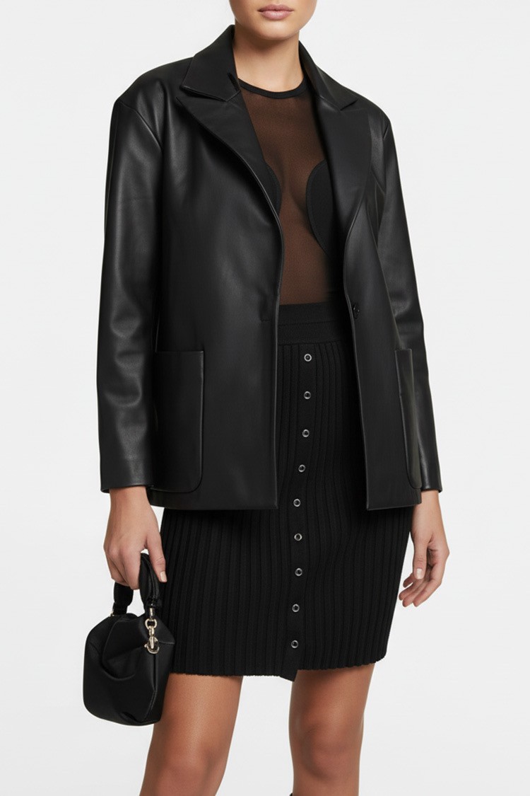 - Elegáns női blézer kiváló minőségű eko bőrből, klasszikus fekete színben.
