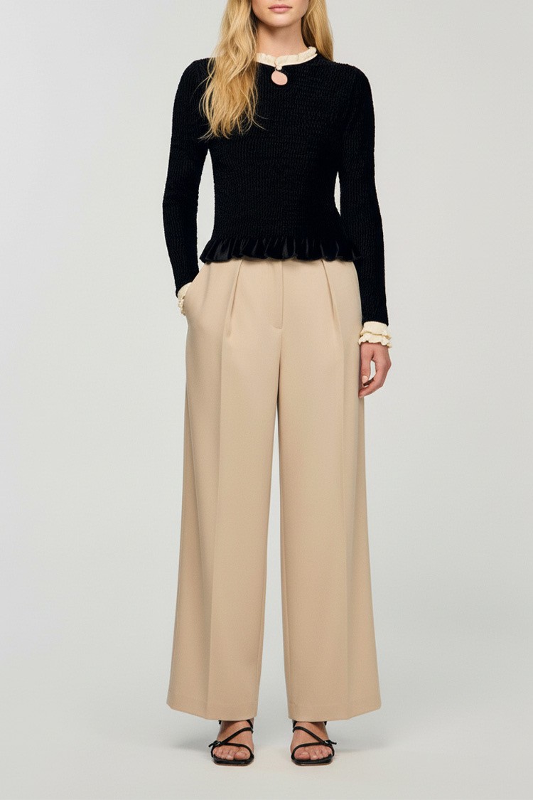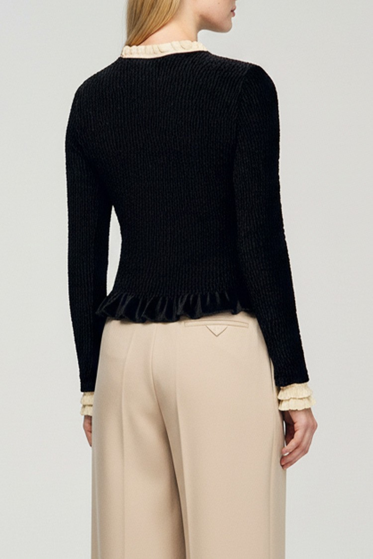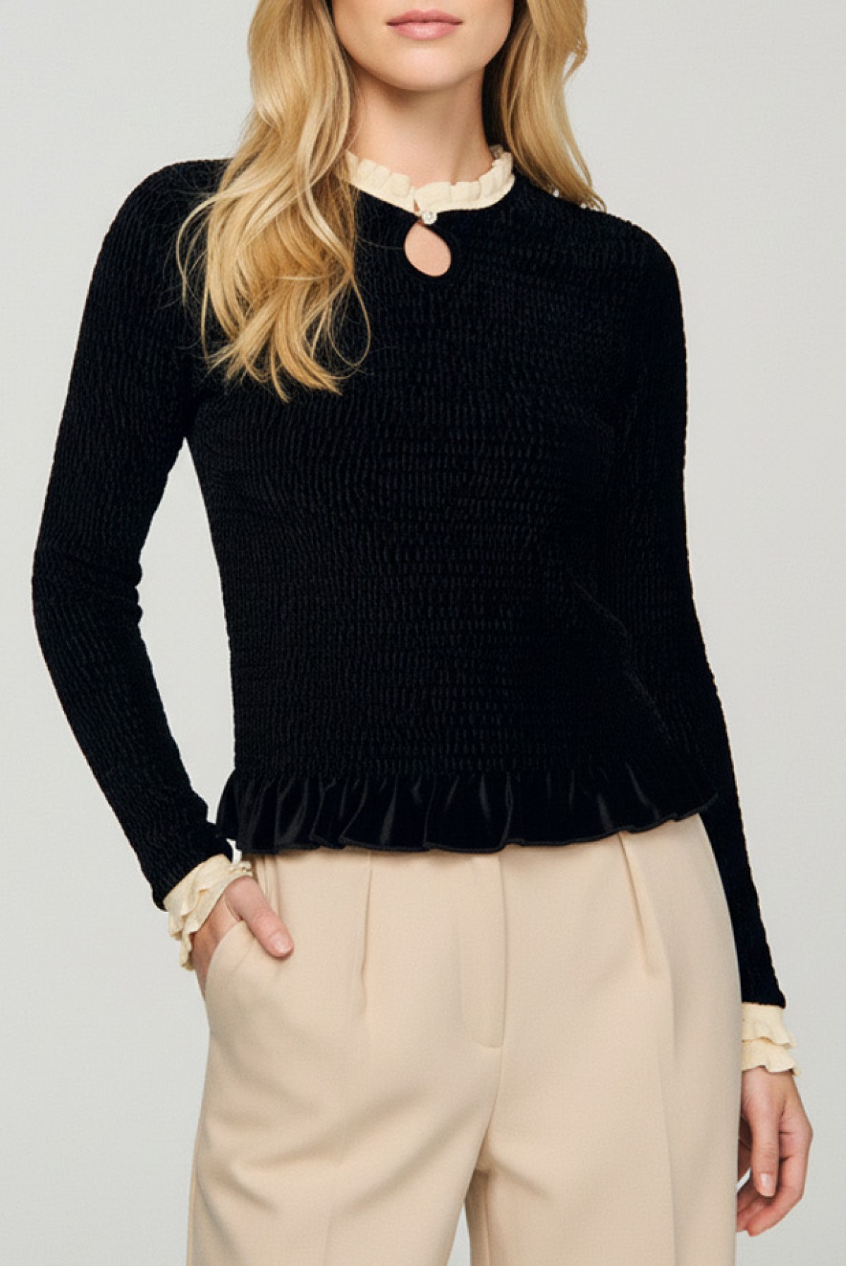 - Elegáns női felső, amely a klasszikus feketét finom bézs díszítéssel ötvözi.