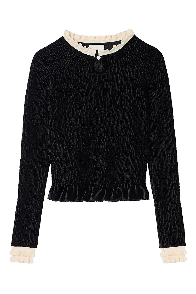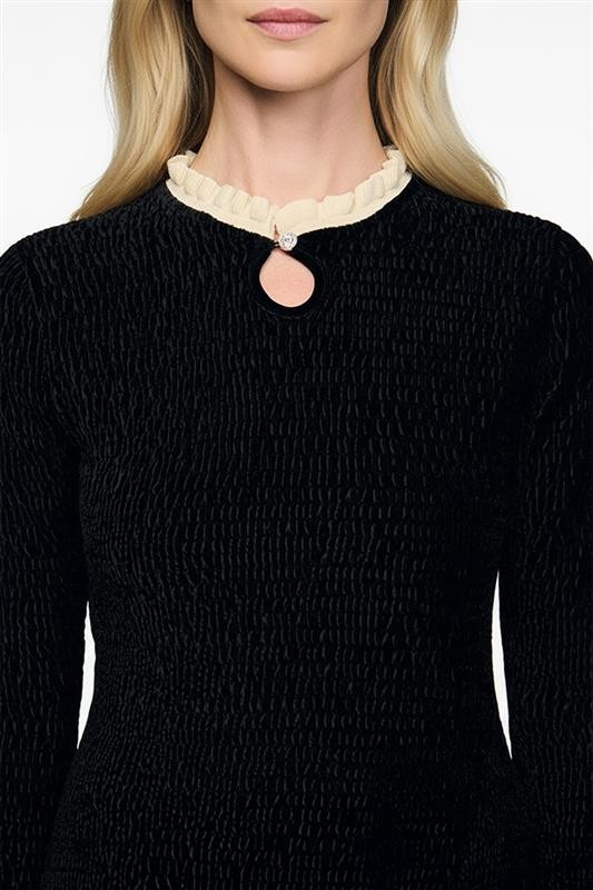 - A modellt az anyag finom dombornyomott a nyakkivágásnál lévő dekoratív nyílás és a gallérnál lévő elegáns fodrok jellemzik.