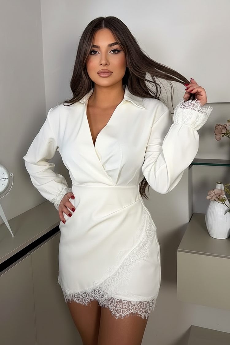 - A modell hosszú ujjú, testhezálló szabású, a ruha végén pedig csipke díszíti.