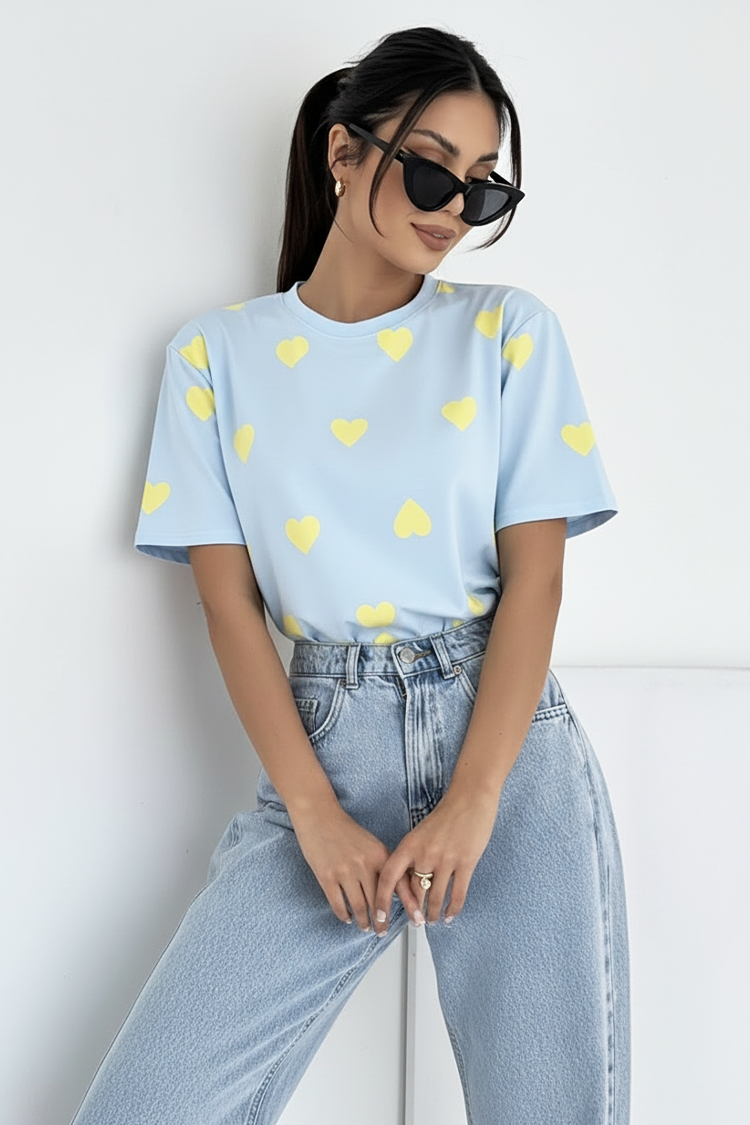 - A modell rövid ujjú, kerek nyakkivágású, precíz szabású és szívmintás.