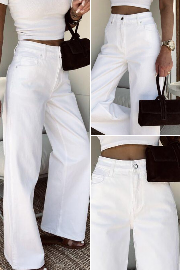 - A modell magas derekú, széles szárú, oldalsó zsebekkel és fehér színű.