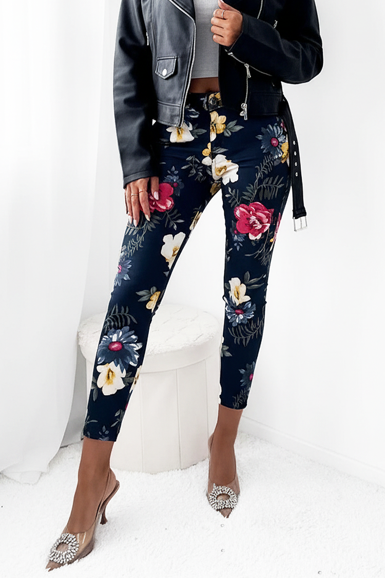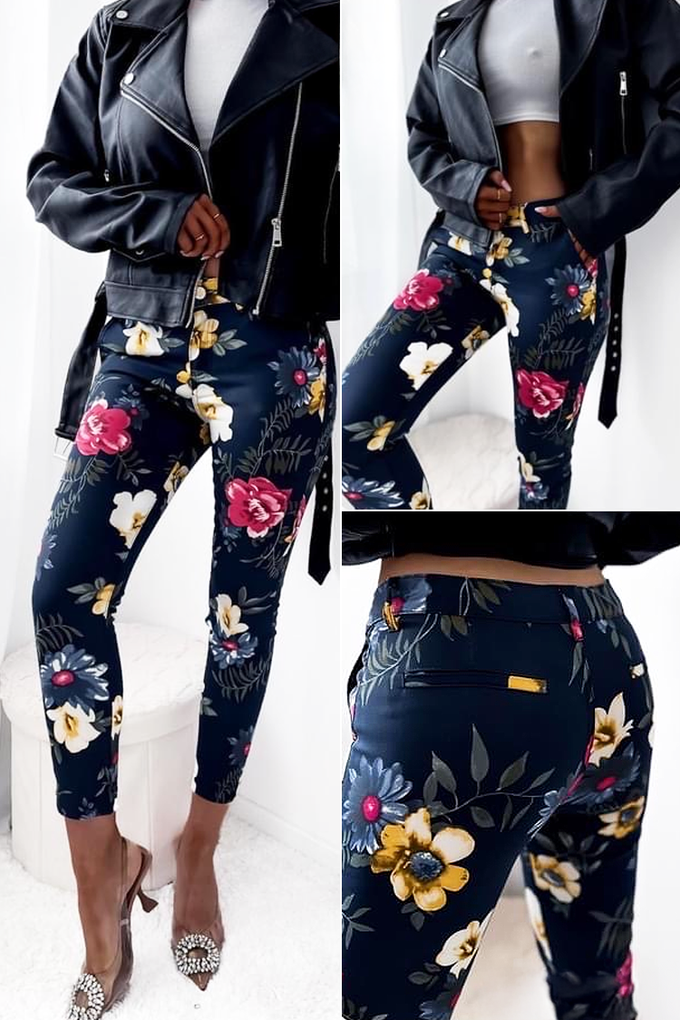- A nadrág középmagas derekú, zsebes, testhezálló szabású és virágmintás.
