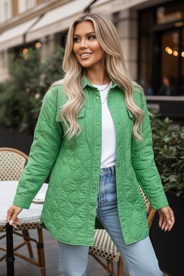 - A modell steppelt mintával, gallérral, zsebekkel és szegecsekkel rendelkezik.