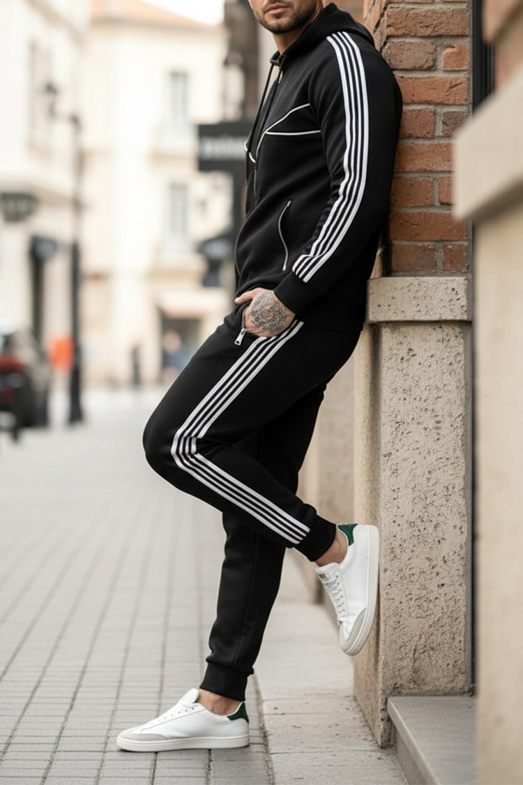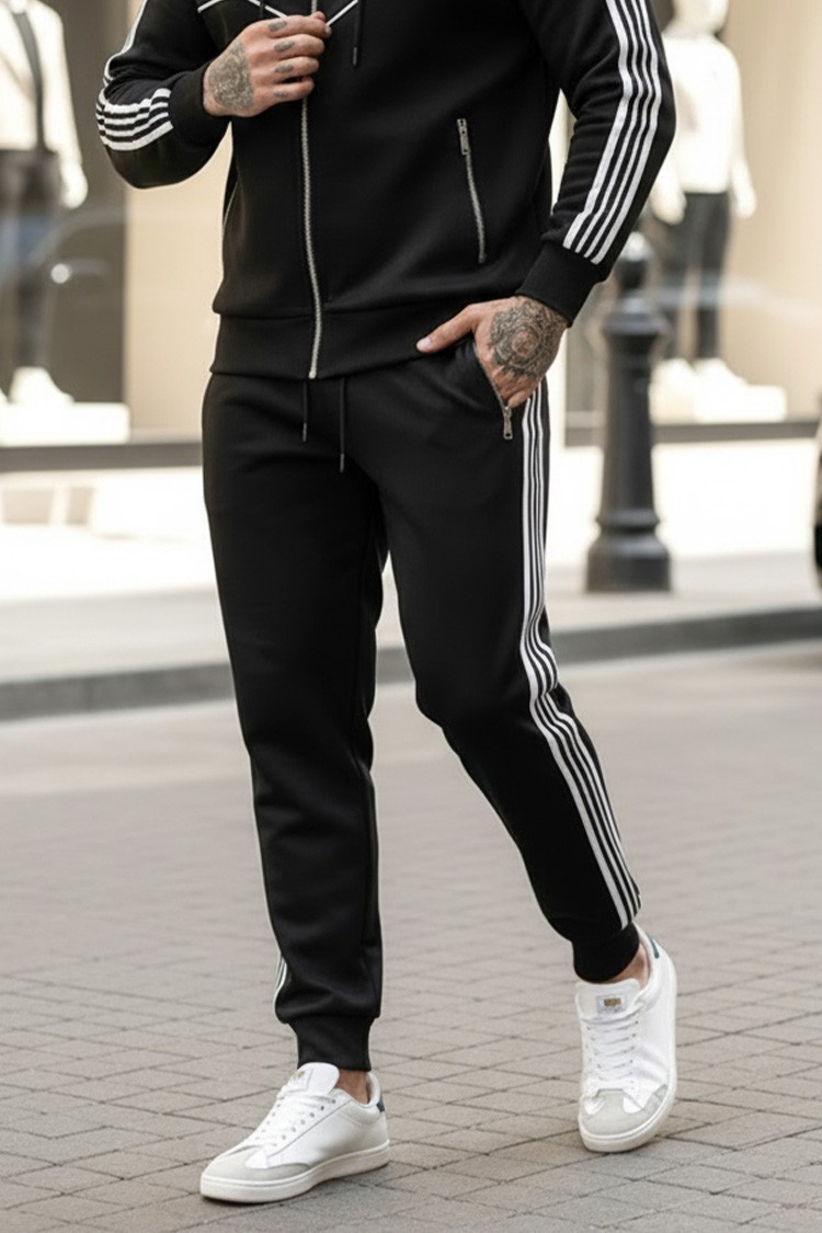 - Kényelmes, kétrészes, fekete férfi szett kontrasztos díszcsíkokakkal, kapucnis kardigán és nadrág.