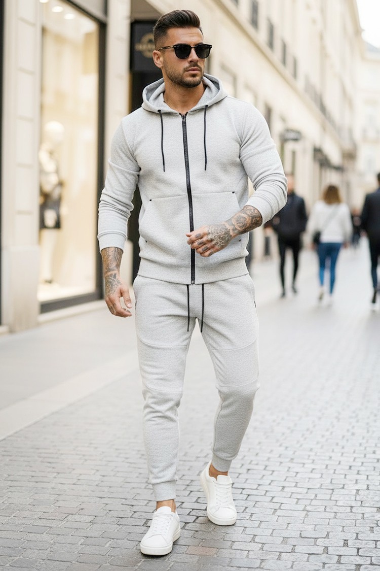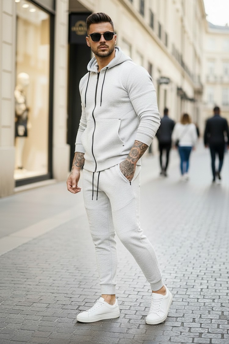 - Praktikus, kétrészes férfi szett, amely egy fekete kapucnis kardigánból és nadrágból áll.