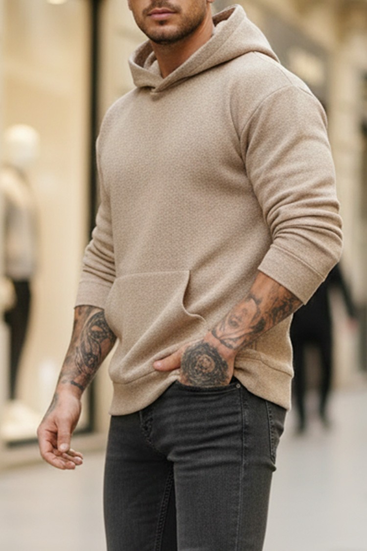 - Kényelmes férfi pulóver finom textúrájú anyagból készült kapucnival bézs színben.