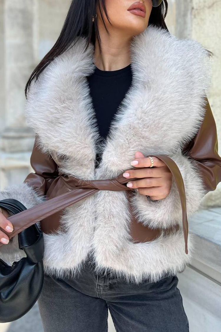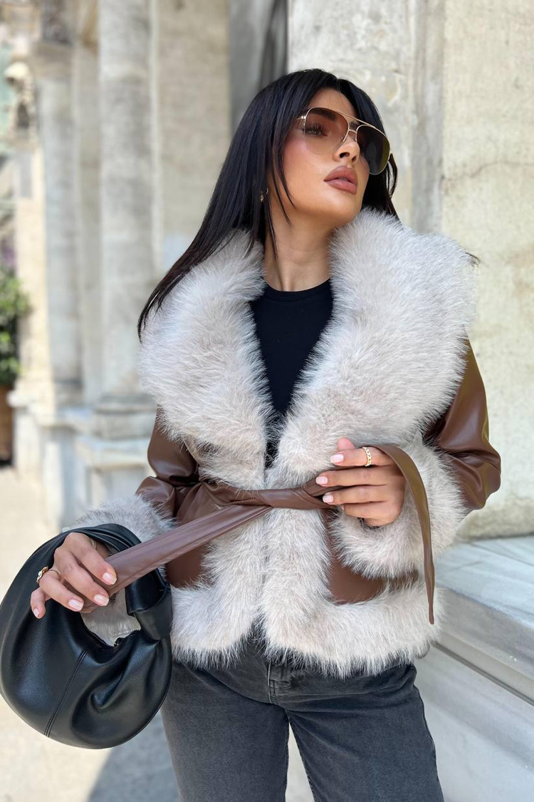 - A modell eko bőrből készült, látványos szőrmés gallérral, világosbarna színben és ugyanabból az anyagból készült övvel.