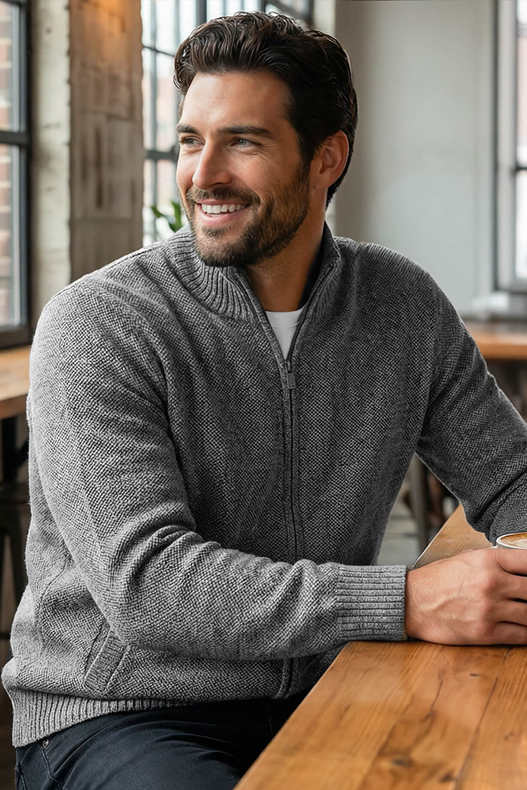 - Klasszikus férfi kardigán magas gallérral, grafit színű, zsebekkel, mindennapi viseletre alkalmas.
