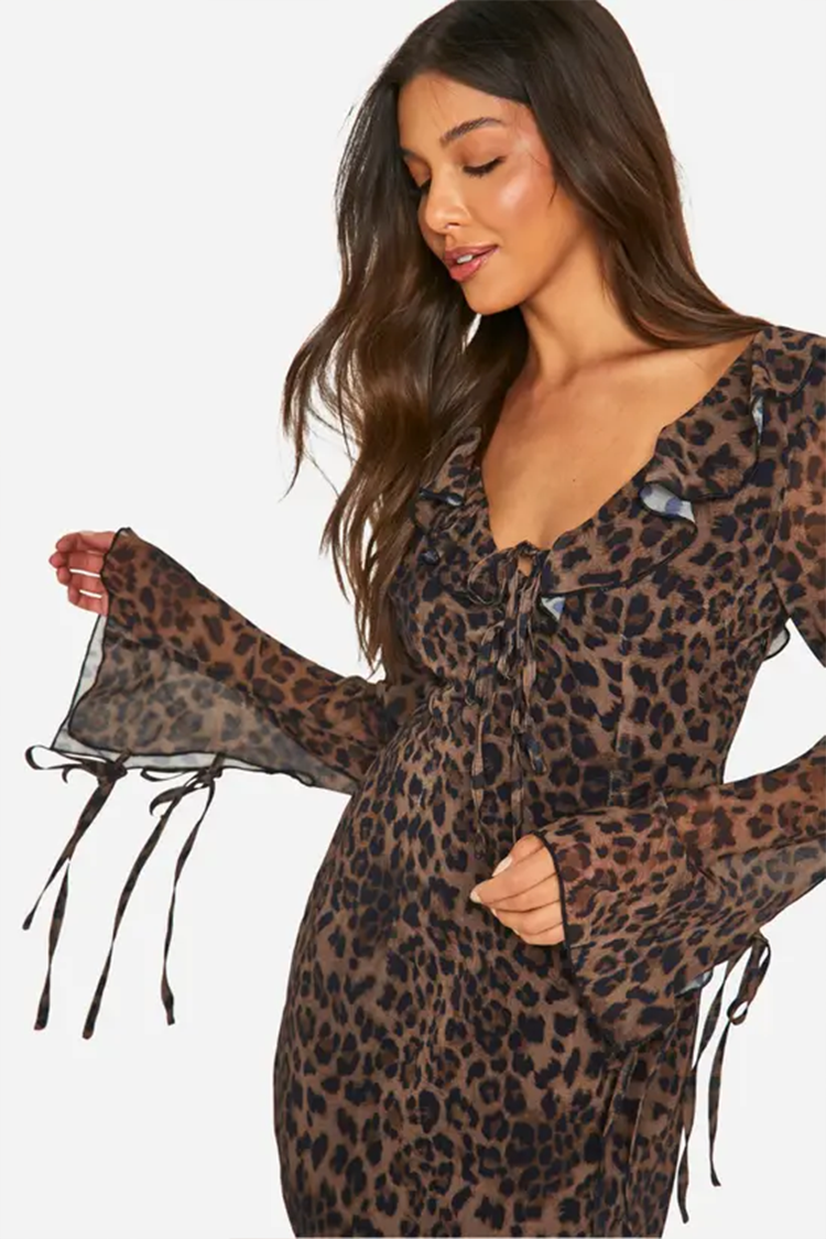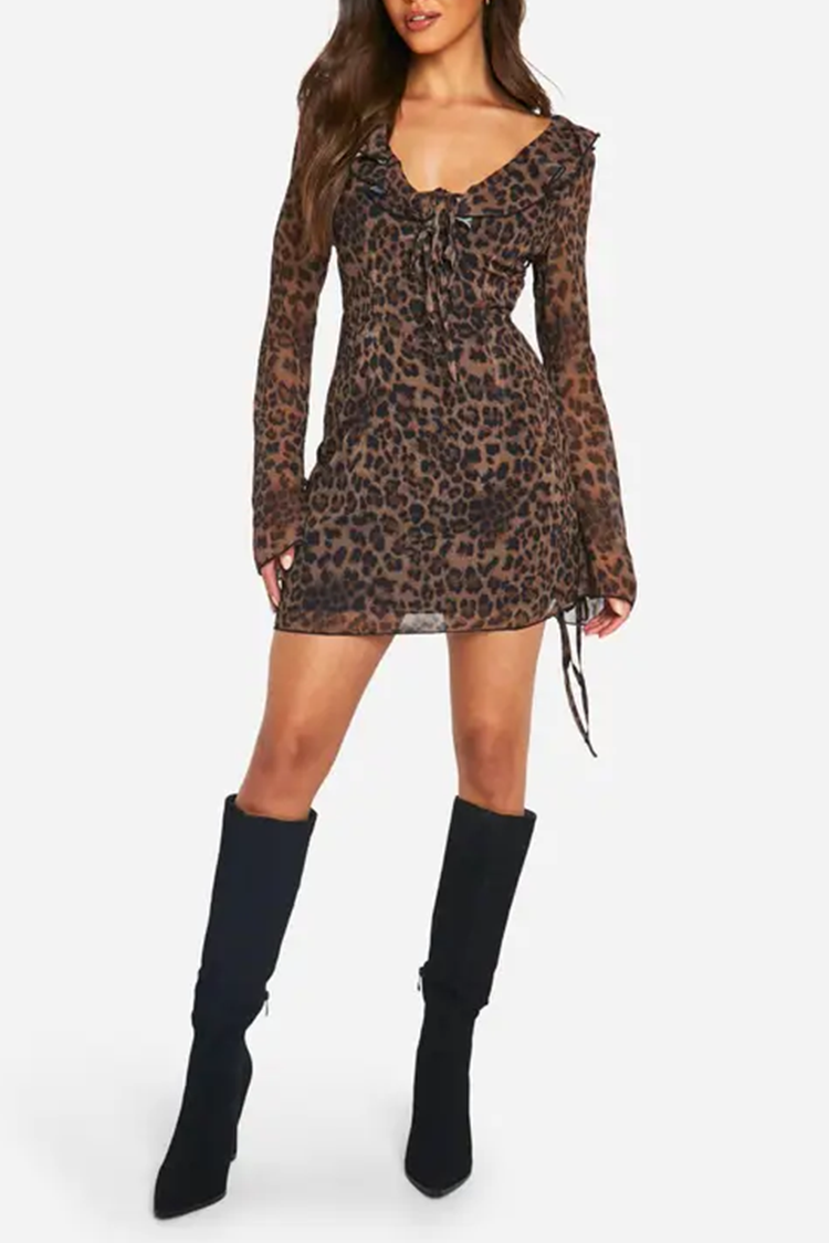 - A ruha vonzó szabású, leopárdmintás, hosszú ujjú és fűzős.