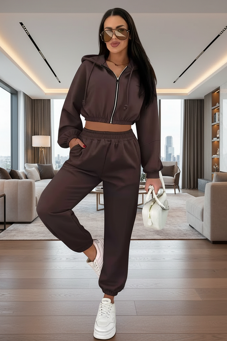 - A kardigán rövid szabású, megkötős kapucnival rendelkezik, és elöl cipzárral záródik.