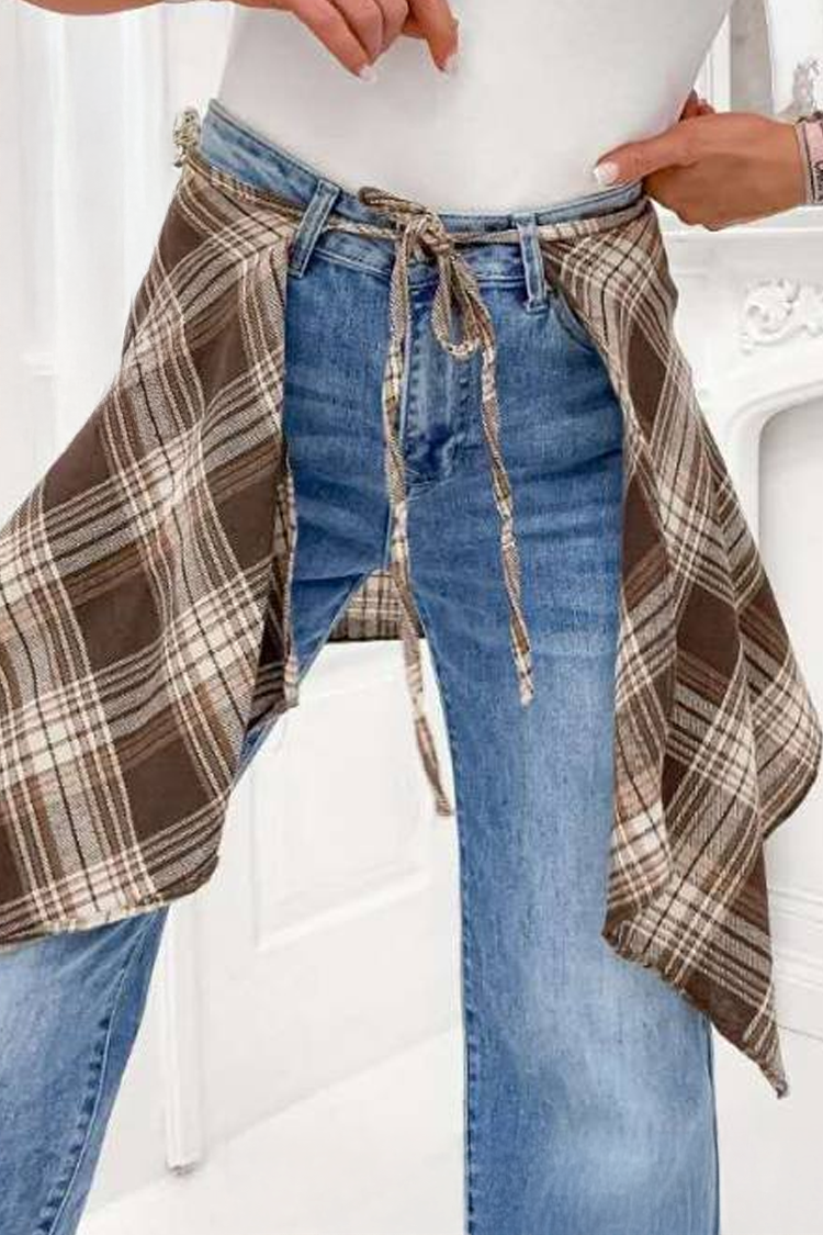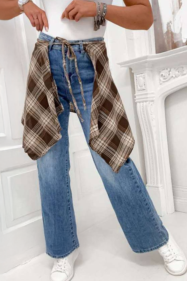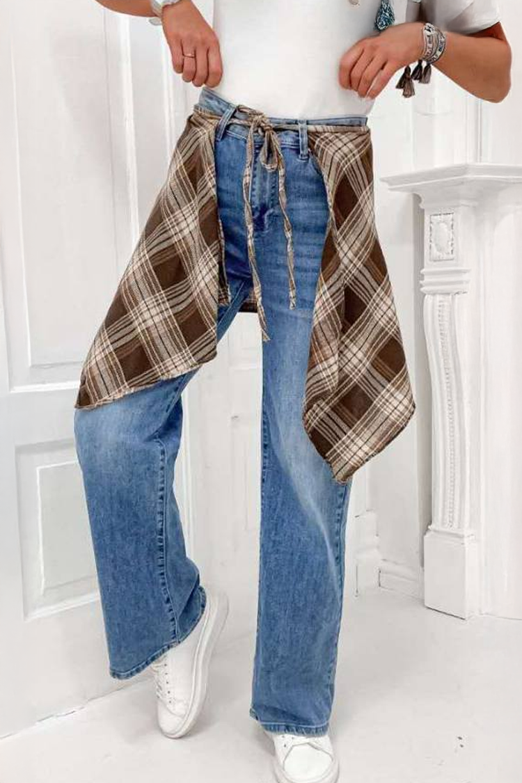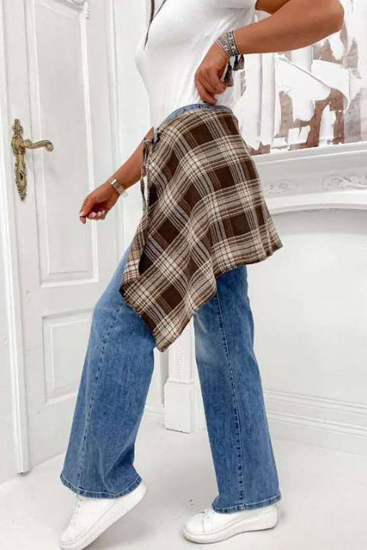 - A modell magas derekú, széles szárú, oldalsó zsebekkel és mutatós, kockás mintás kendővel rendelkezik.