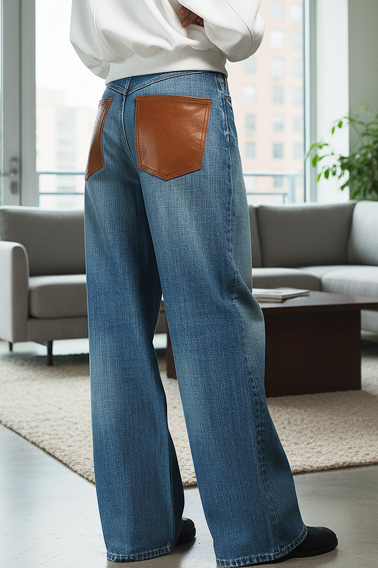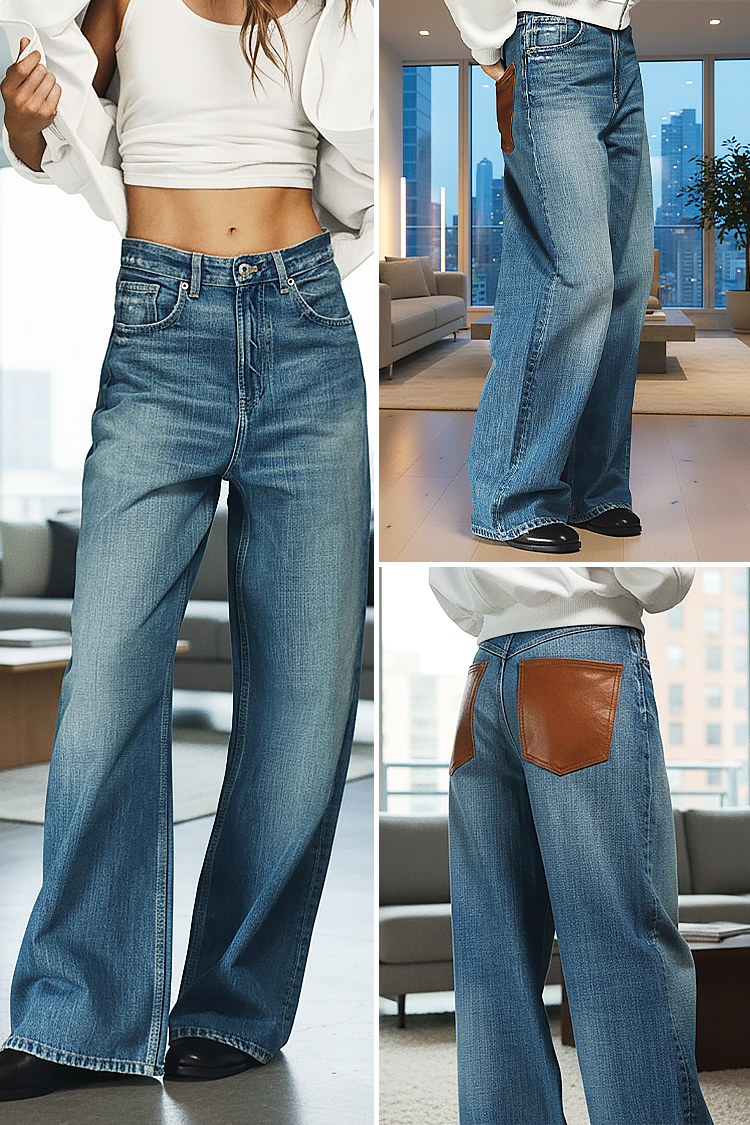 - A modell magas derekú, széles szárú és kontrasztos barna hátsó zsebekkel rendelkezik.