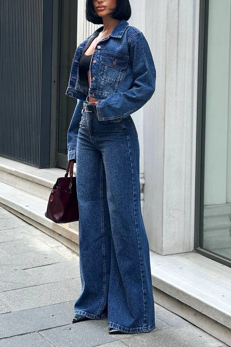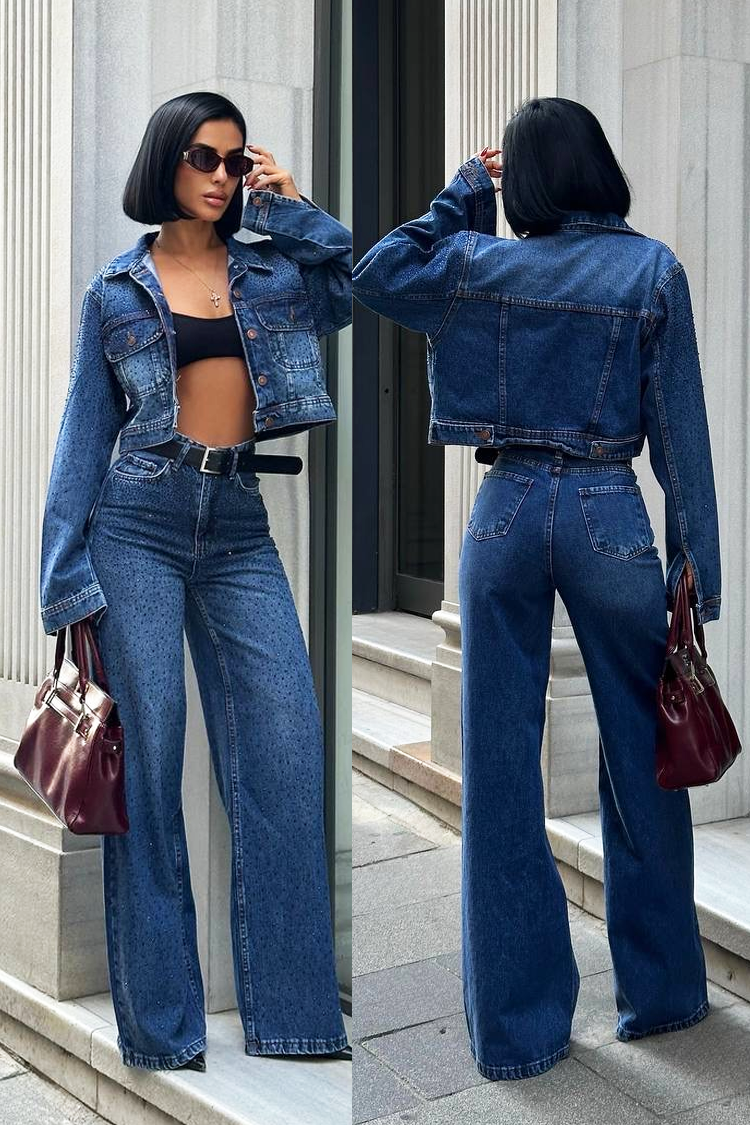 - A dzseki elöl hagyományos gombos rögzítéssel rendelkezik, a farmer pedig magas derekú és divatos szabású.