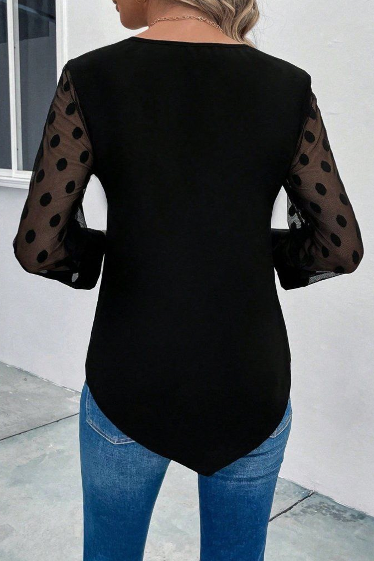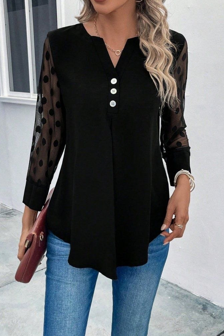 - A modell vonzó dizájnnal, tüll hatású ujjal és pöttyös-gombos mintával rendelkezik az elején.