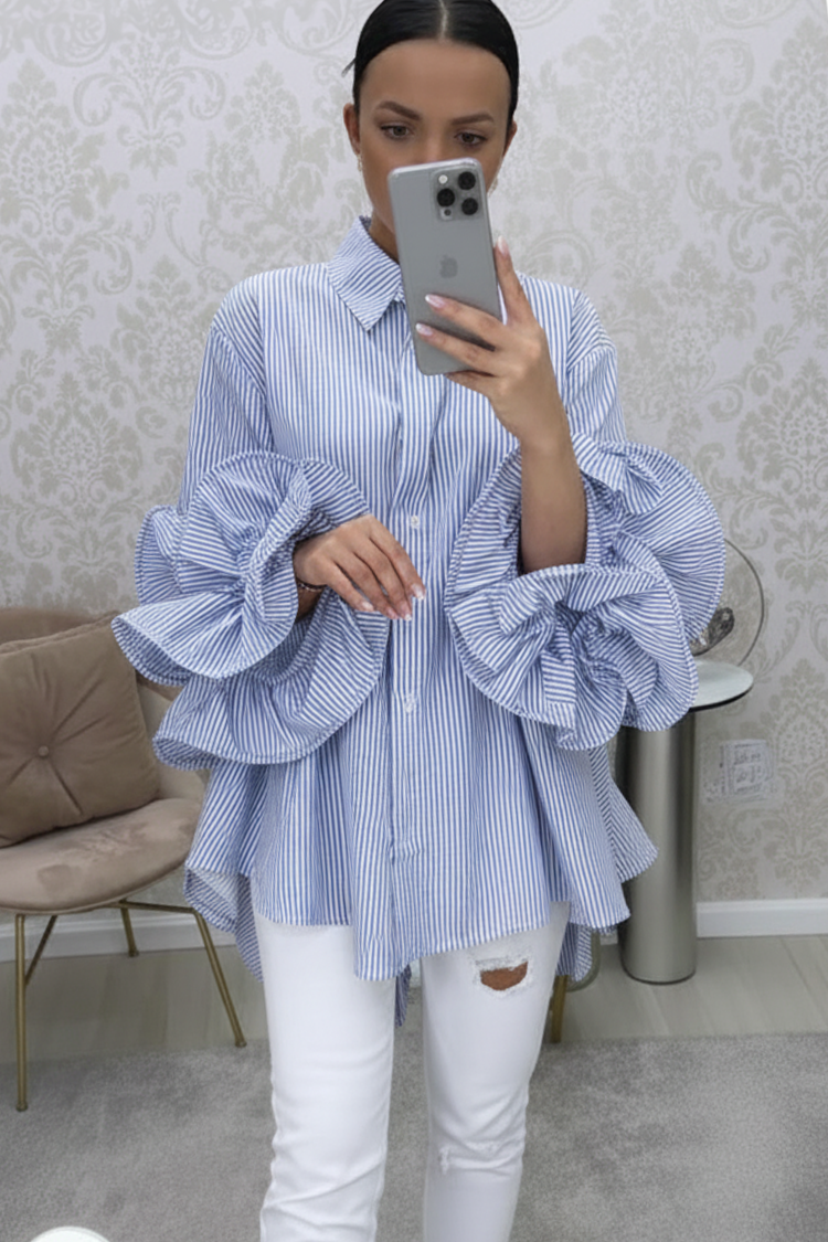 - A modell teljes hosszában gombokkal, látványos fodrokkal, csíkos mintával.