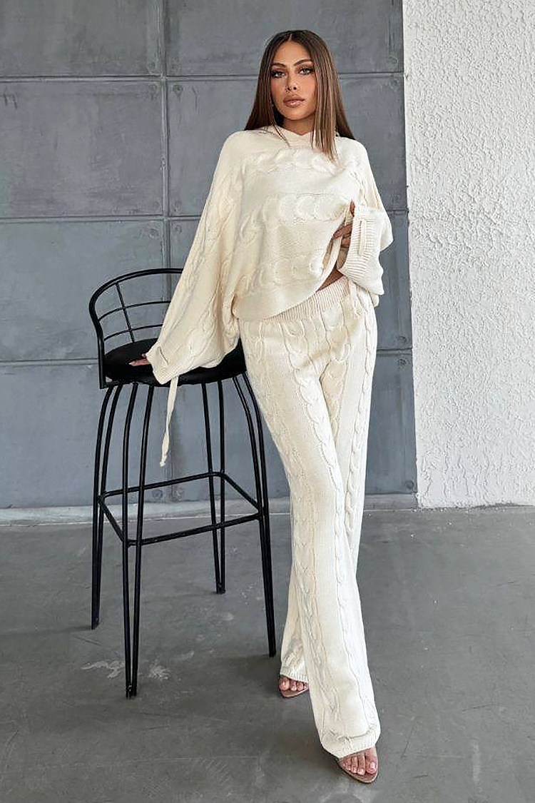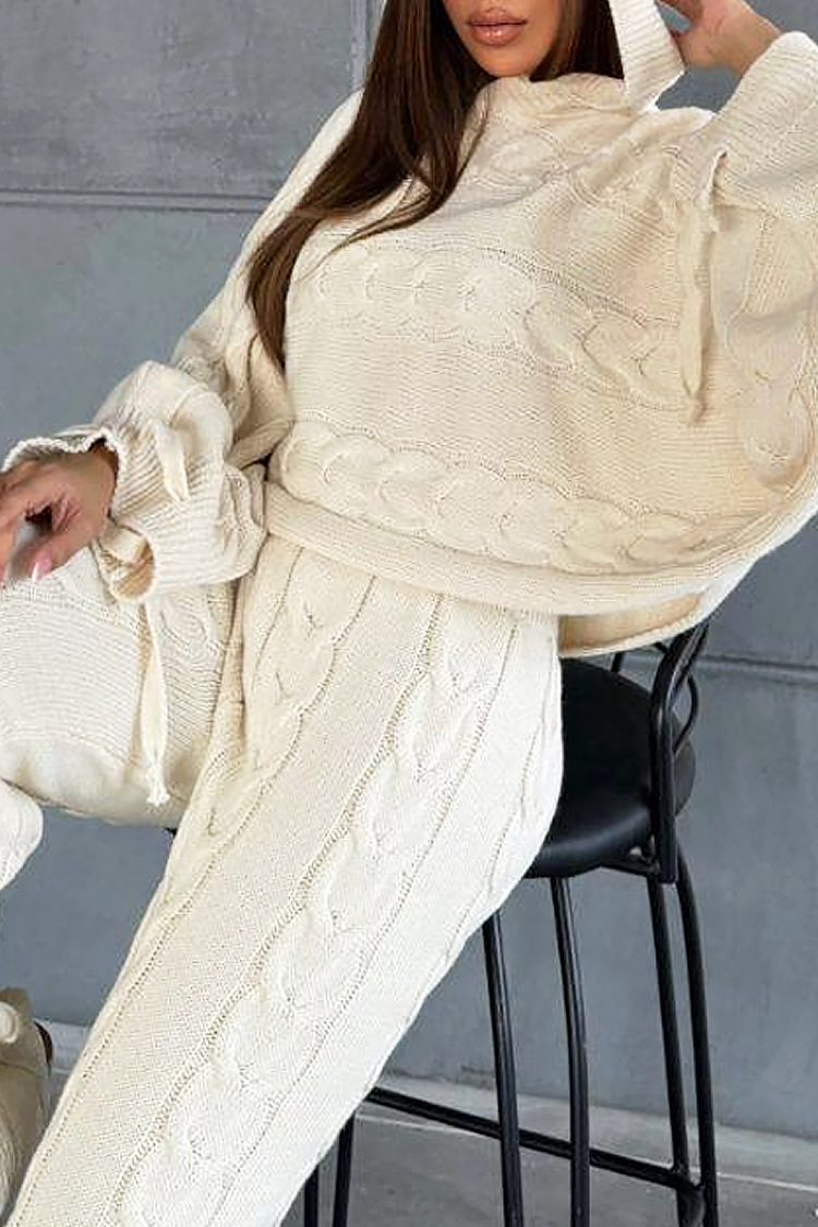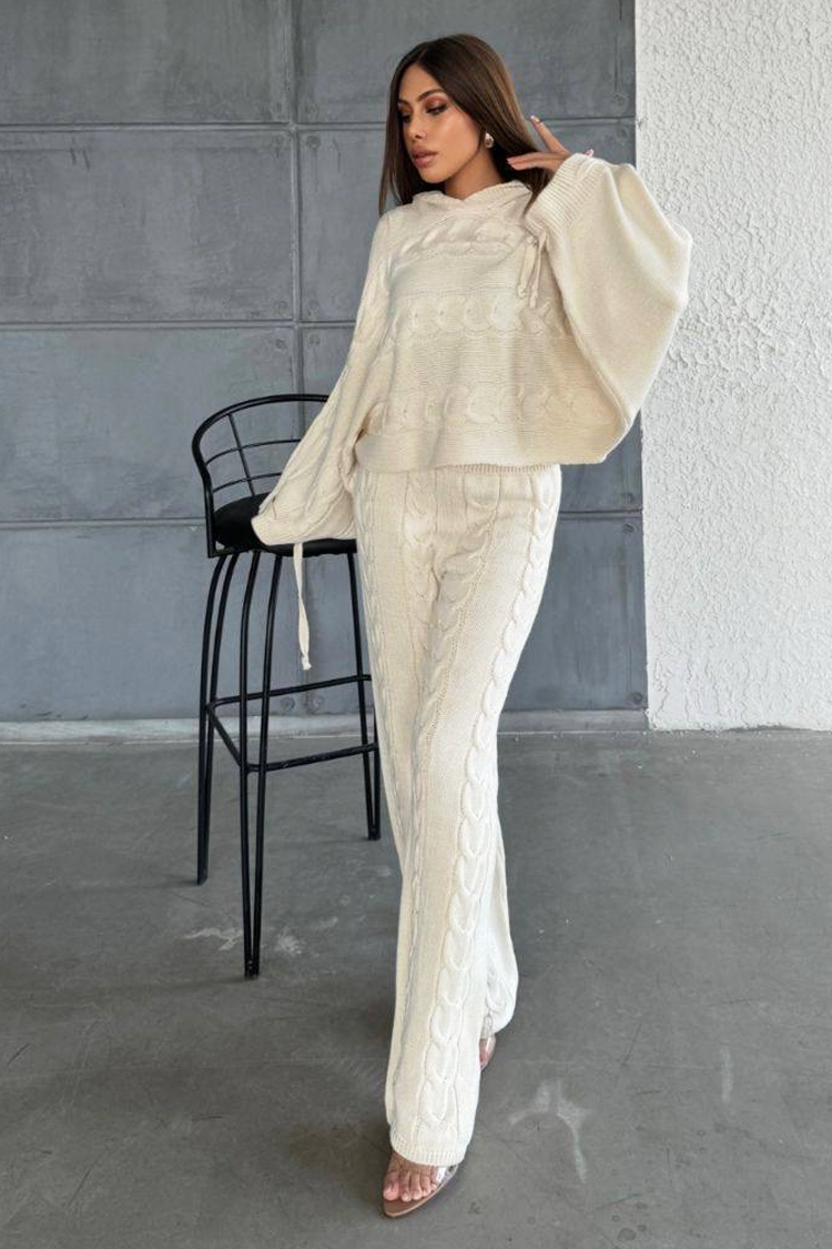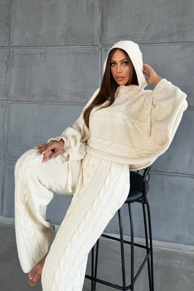 - A pulóver laza szabású és kapucnis, a nadrág pedig bővülő szabású és magas derekú.