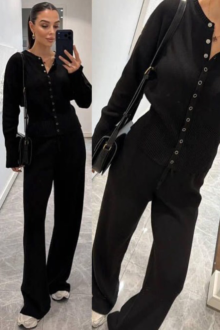 - A kardigán klasszikus szabású és gombos, a nadrág pedig kényelmes kialakítású és magas derekú.