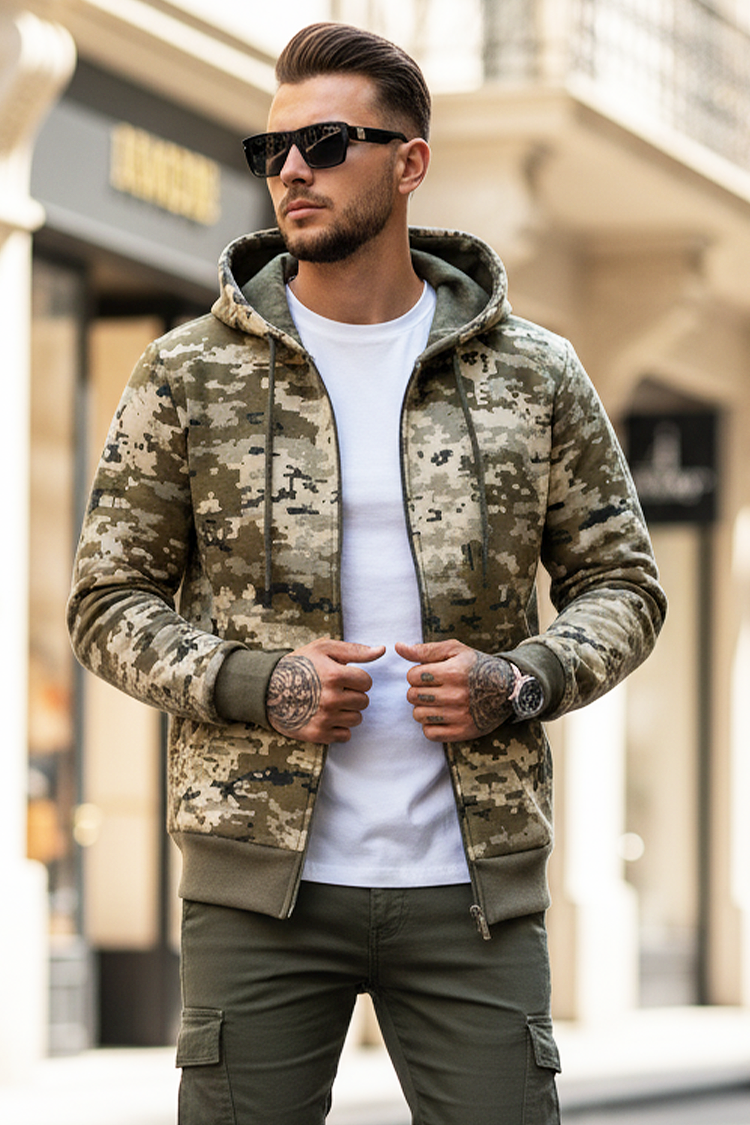 - Trendi férfi pulóver terepszínű mintával és zsebekkel, mindennapi viseletnek vagy szabadidőre egyaránt.
