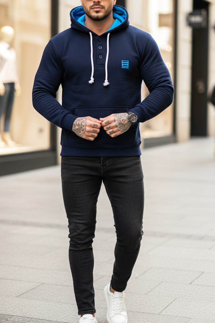 - Praktikus férfi pulóver gombos nyakkivágással és megkötős kapucnival, mindennapi használatra vagy szabadidőre egyaránt alkalmas.