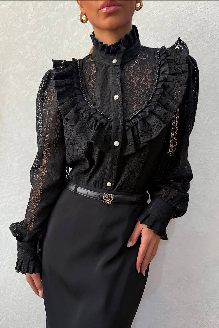 - A modell teljes hosszában gombokkal, stílusos dizájnnal és látványos fodros díszítéssel, csipkével és gyöngyökkel rendelkezik.