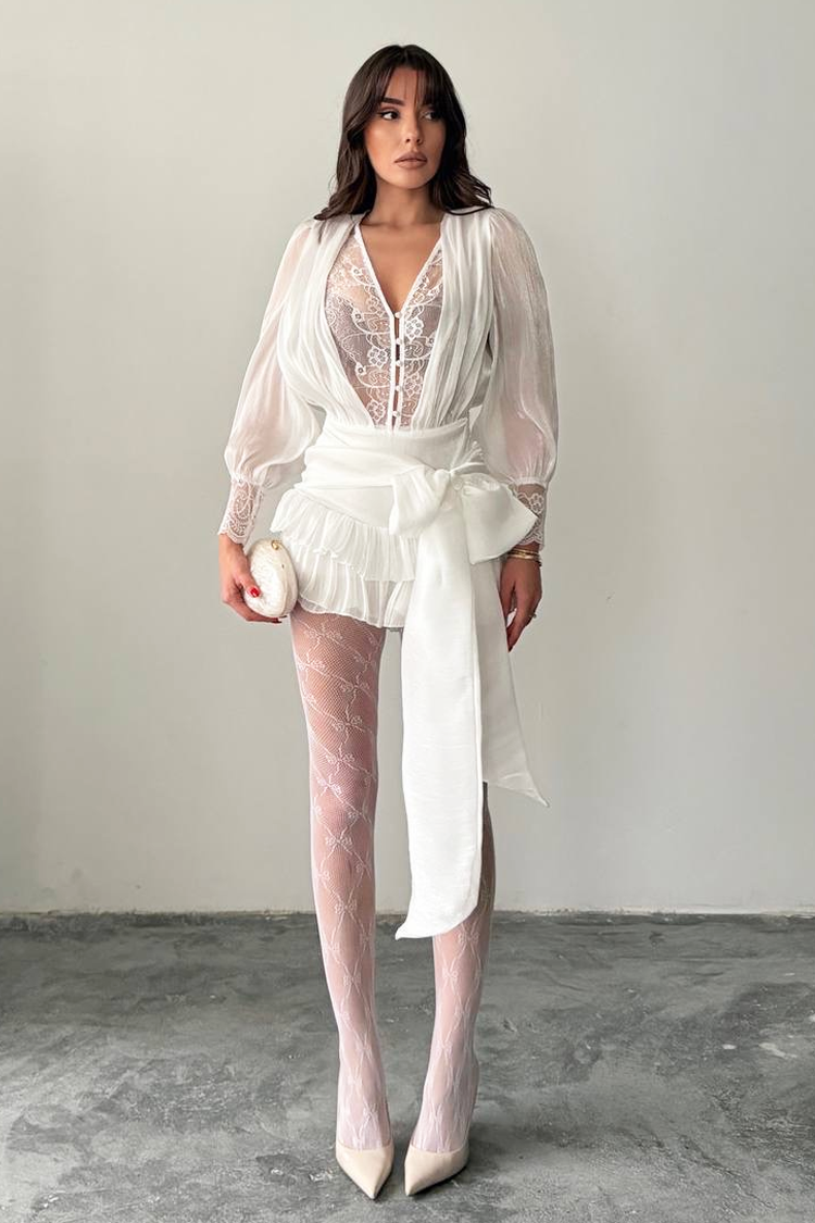 - A modell kivágott dekoltázzsal, csipkével, alul fodros díszítéssel és látványos szalaggal rendelkezik.