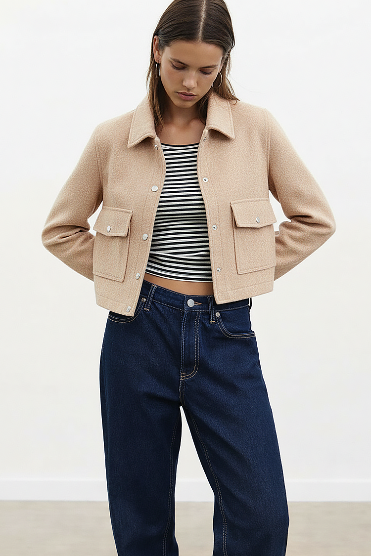 - A modell egyszínű, oldalsó zsebekkel, gallérral és crop-top, rövid fazonnal rendelkezik.