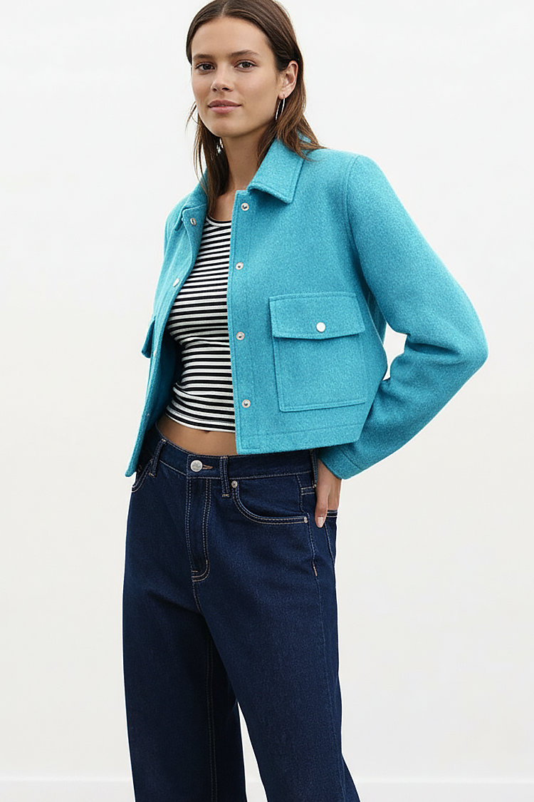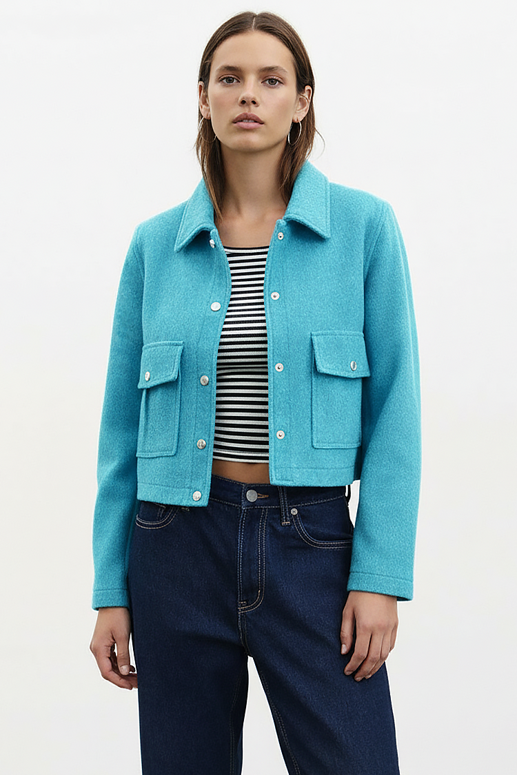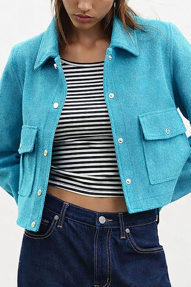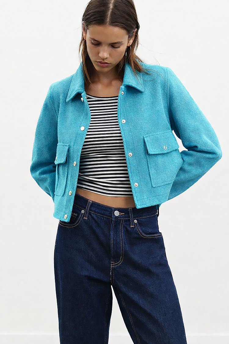 - A modell egyszínű, oldalsó zsebekkel, gallérral és crop-top, rövid fazonnal rendelkezik.