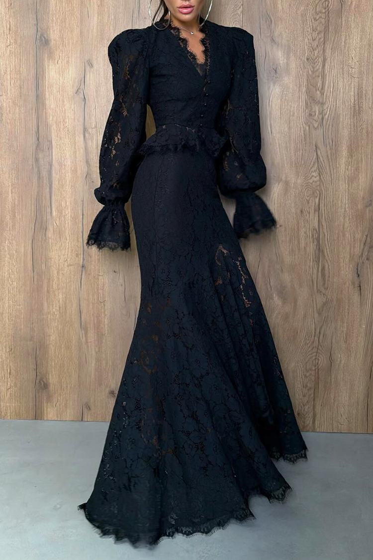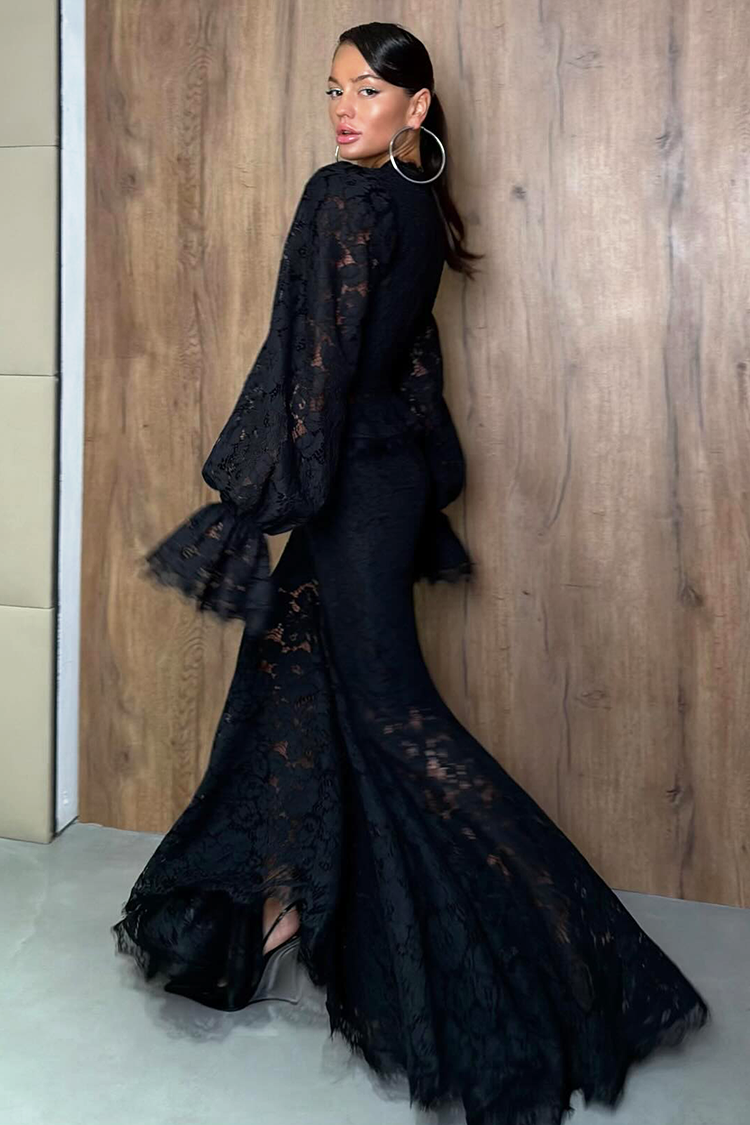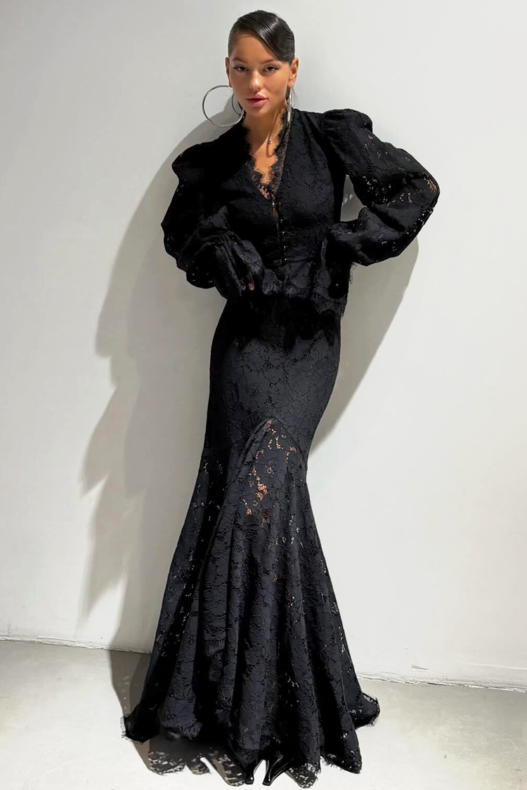 - A blúz hosszú, mutatós ujjal és stílusos gombokkal rendelkezik a nyakkivágásnál. A szoknya magas derekú és hosszú fazonú.