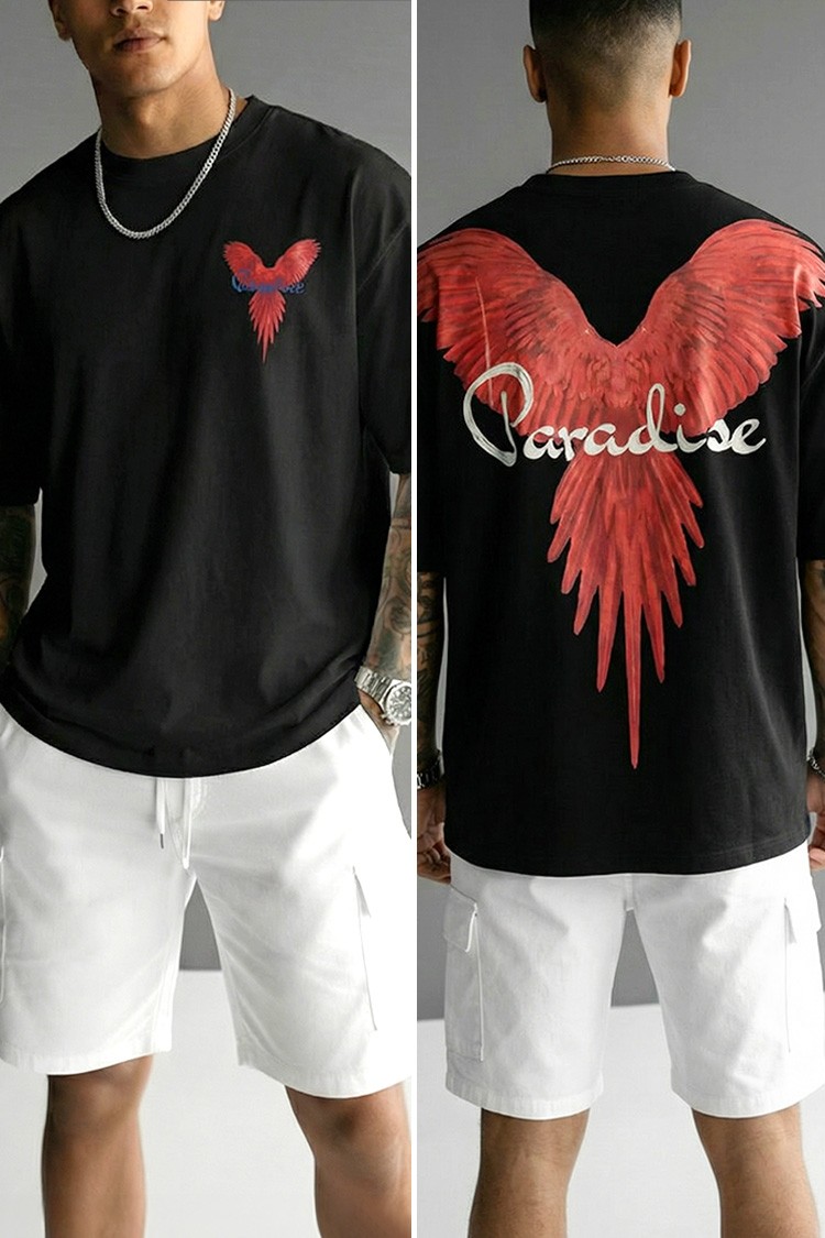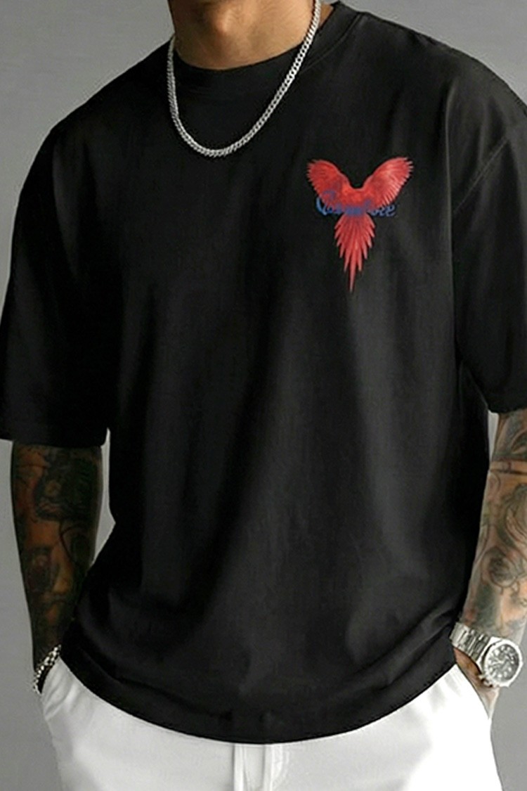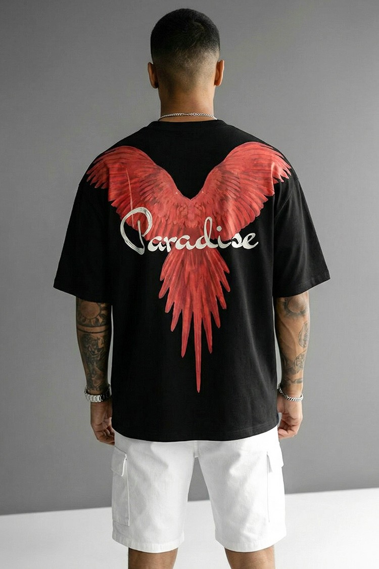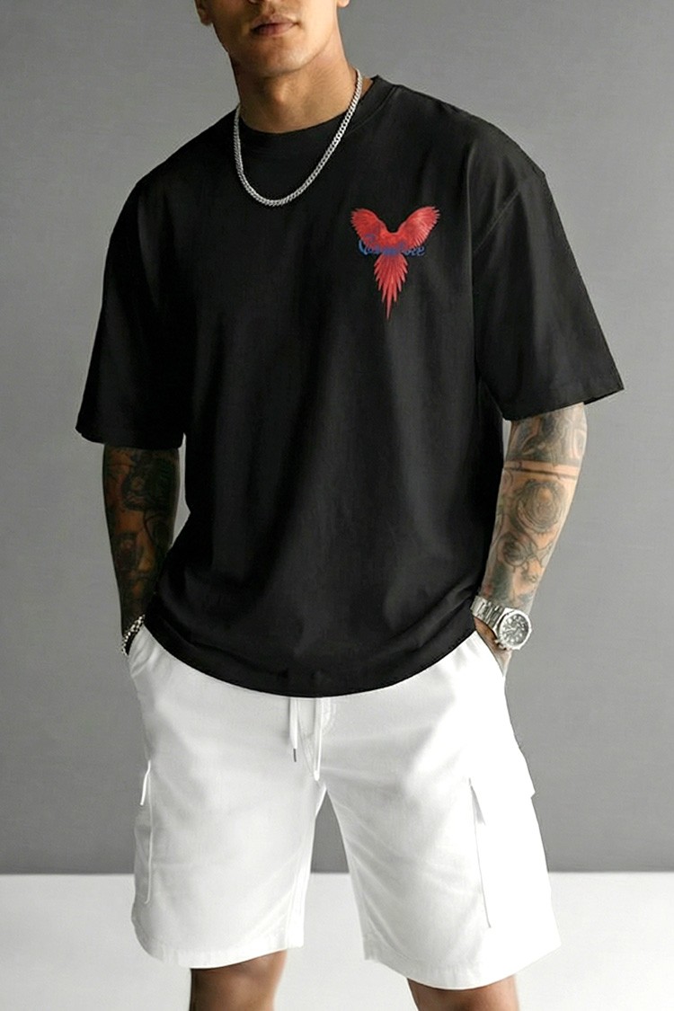 - Trendi férfi póló kényelmes szabással, elülső és hátsó nyomattal, amely alkalmas mindennapi viseletre, sétákra vagy sportos megjelenés kiegészítéseként.