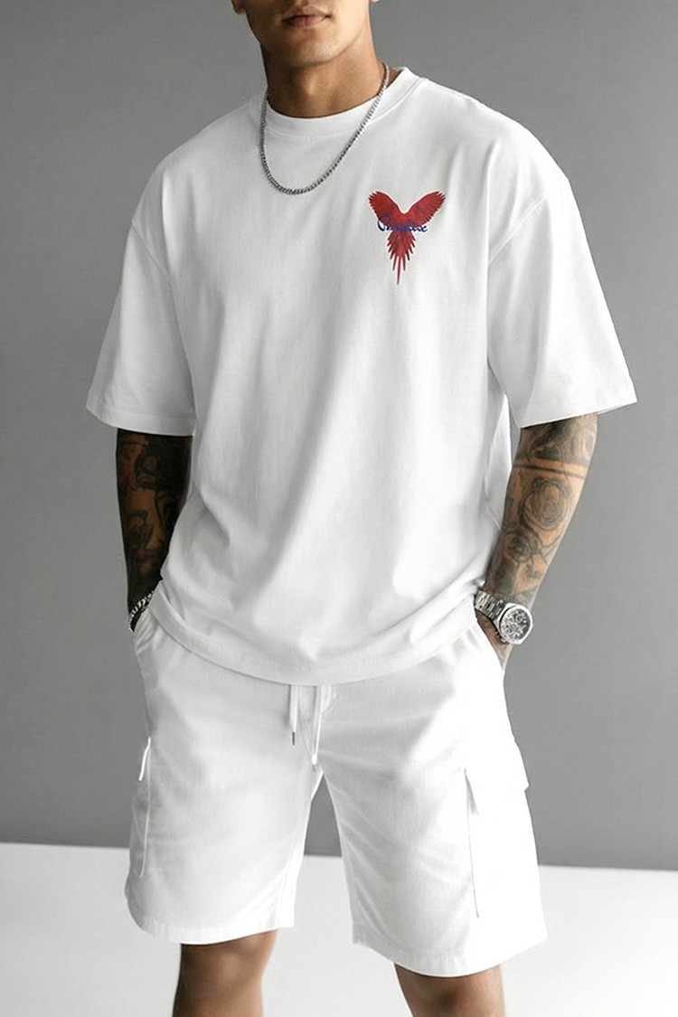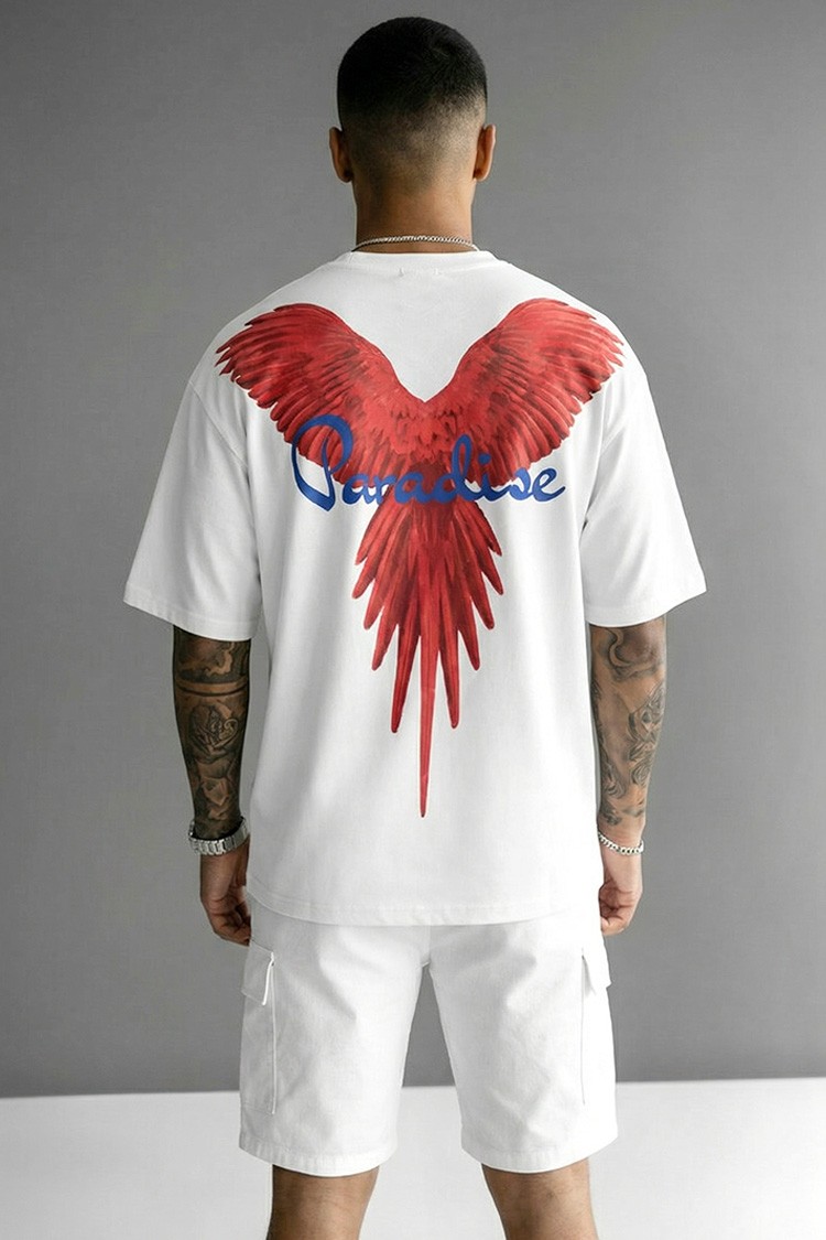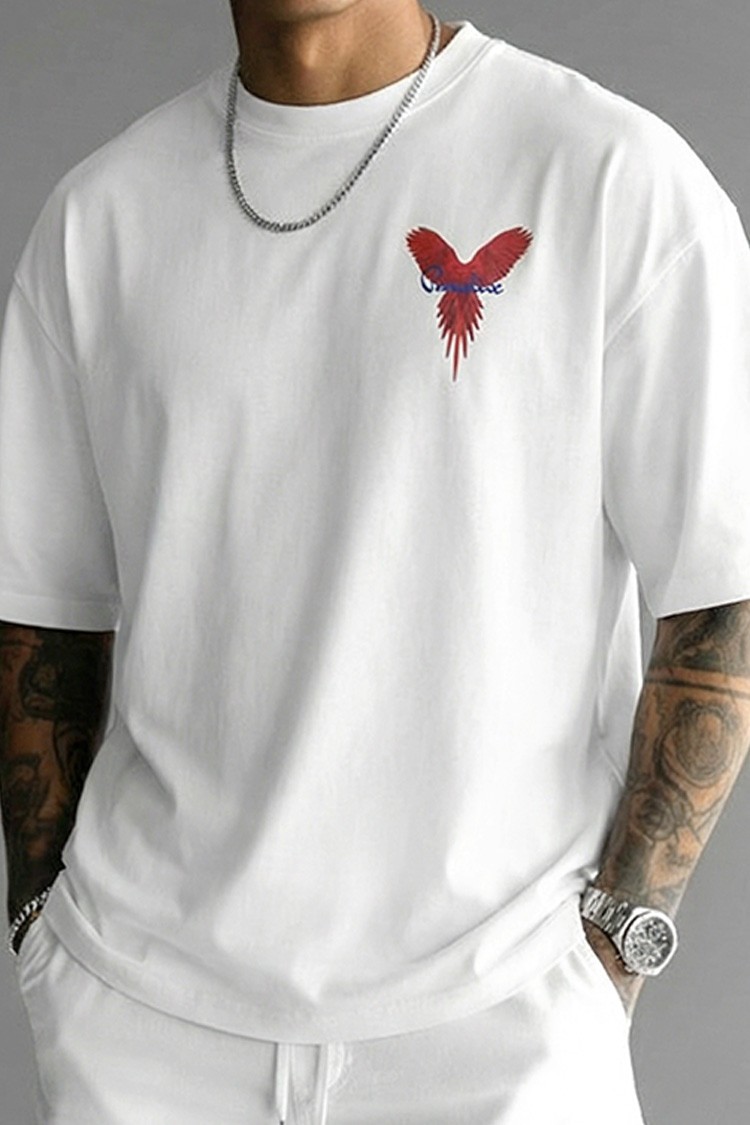 - Trendi férfi póló kényelmes szabással, elülső és hátsó nyomattal, amely alkalmas mindennapi viseletre, sétákra vagy sportos megjelenés kiegészítéseként.