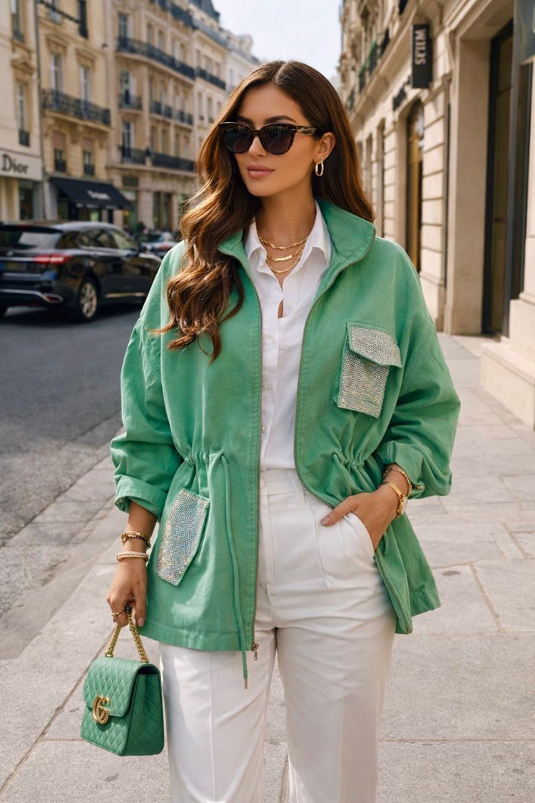 - A modell zöld színű, rugalmas derékkal, amely kiemeli az alakot, látványos zsebekkel és gallérral.