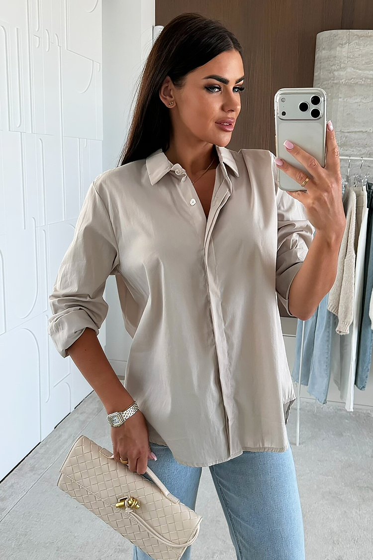 - A modell hosszú ujjú, kényelmes szabású és gombos rögzítésű a hosszában.