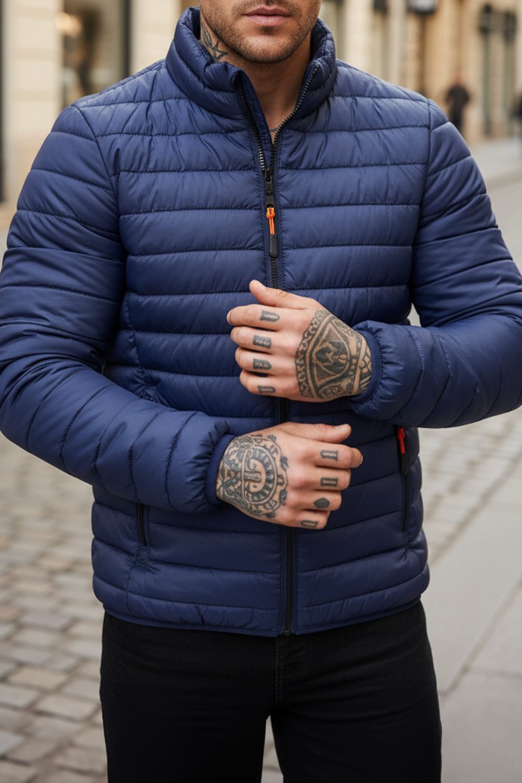 - Steppelt férfi dzseki egyszerű szabással, sötétkék színben, alkalmas az átmeneti évszakokra.