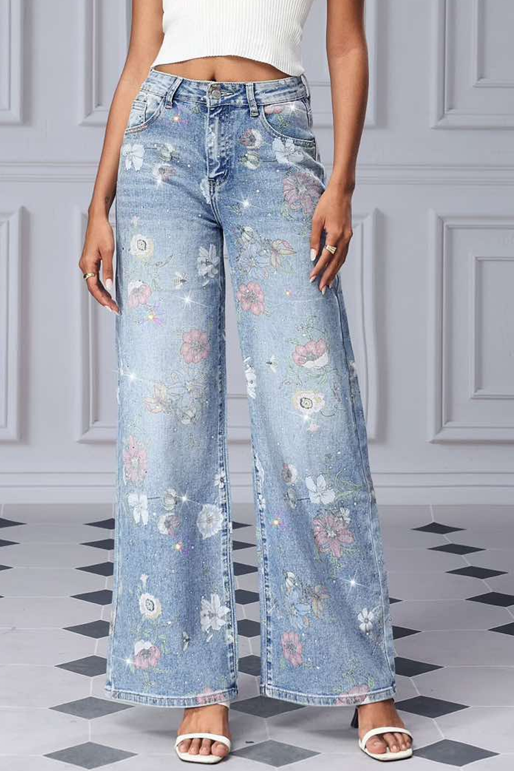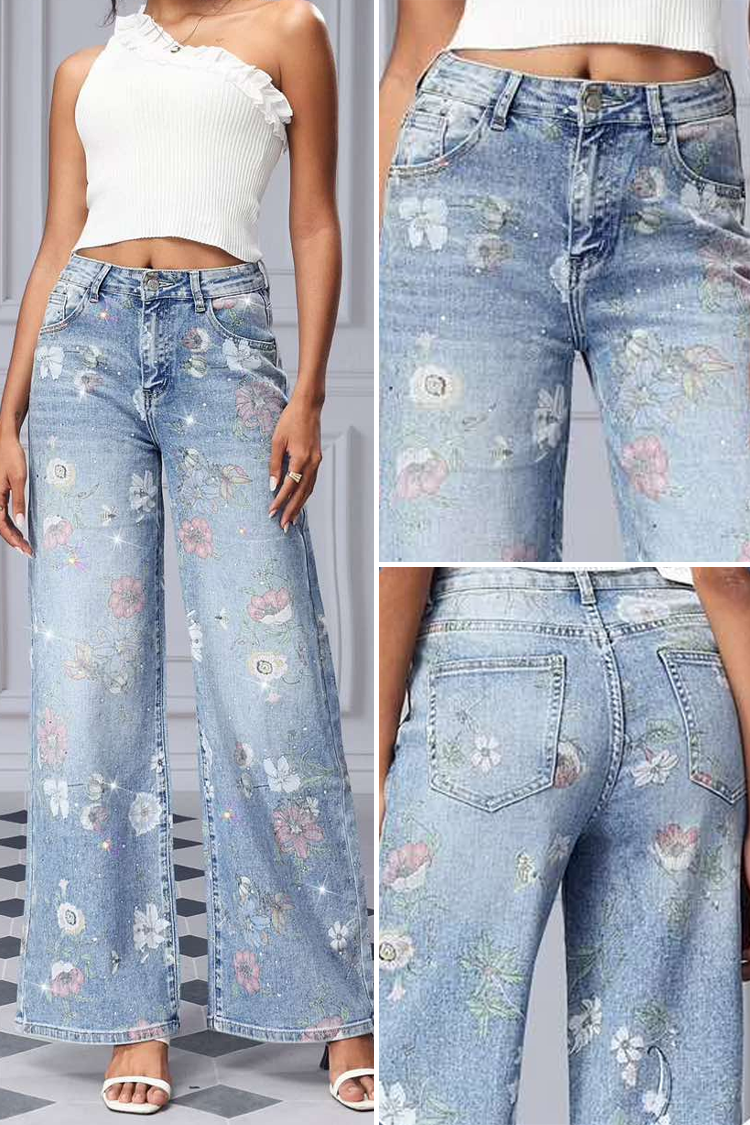 - A modell magas derekú, széles szárú, csillogó részletekkel és virágmintával rendelkezik.
