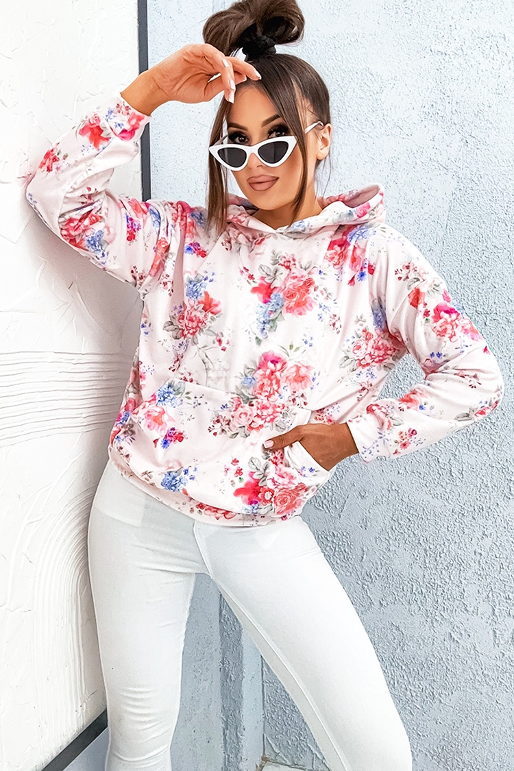- Trendi női pulóver kapucnival és virágmintával, amely illik a divatos mindennapokhoz.