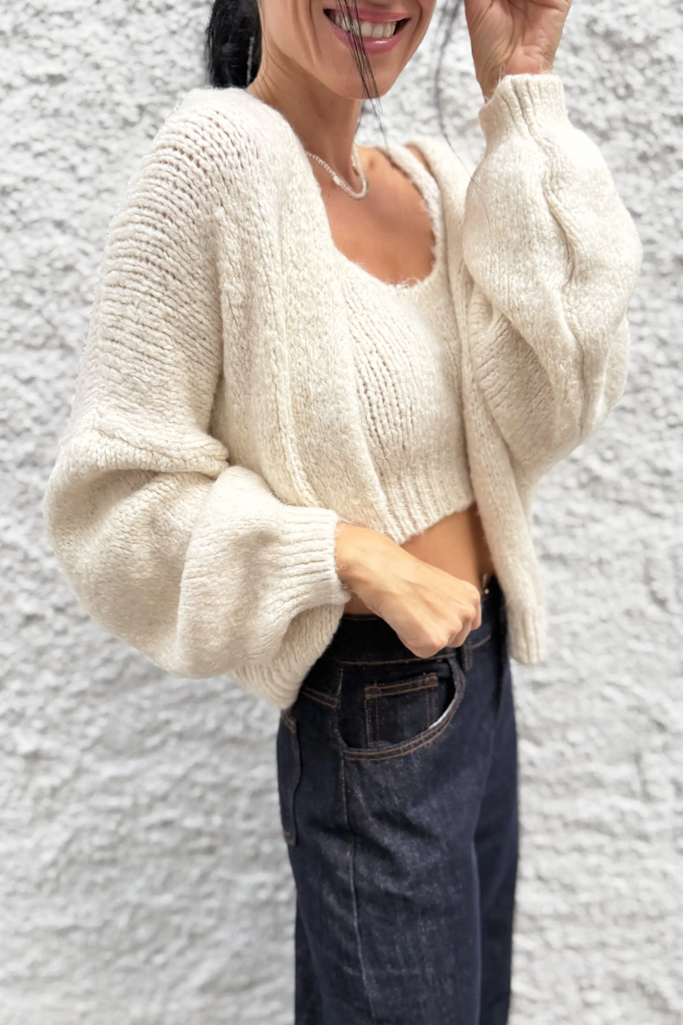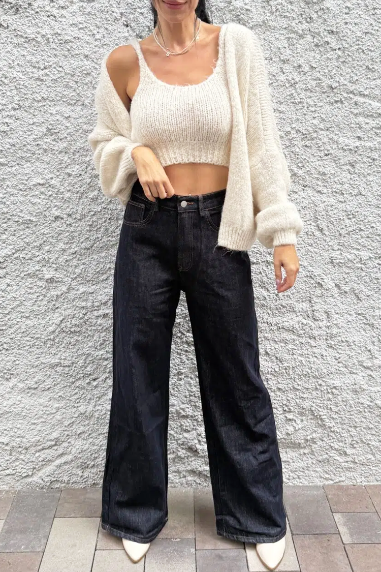 - A top testhezálló szabású és crop-top hosszúságú, a kardigán pedig hosszú ujjú és klasszikus szabású.