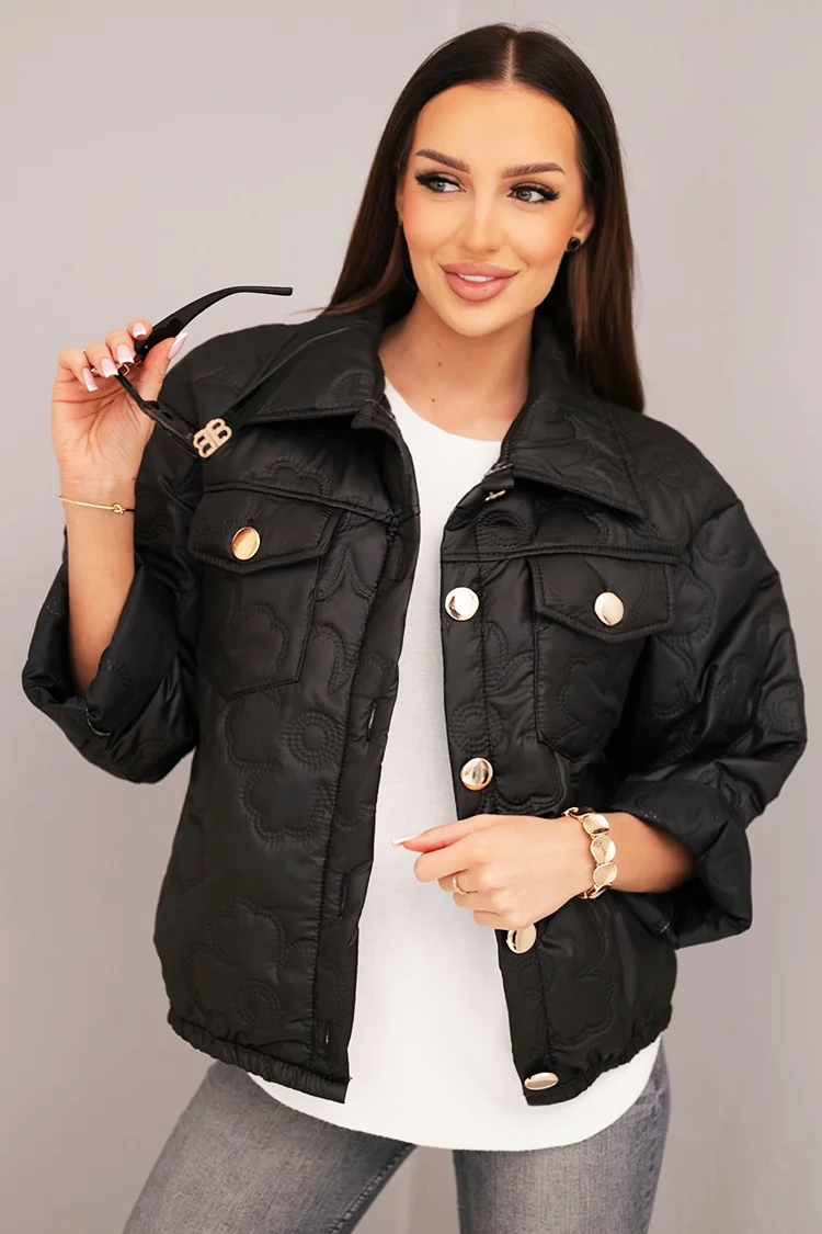 - A modell rövid fazonú, steppelt kialakítású, elöl zsebekkel és gombos rögzítéssel.
