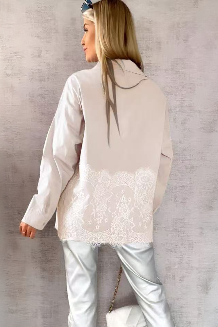 - A modell hosszú ujjú, klasszikus szabású, gallérral, gombokkal és mutatós csipkével rendelkezik.