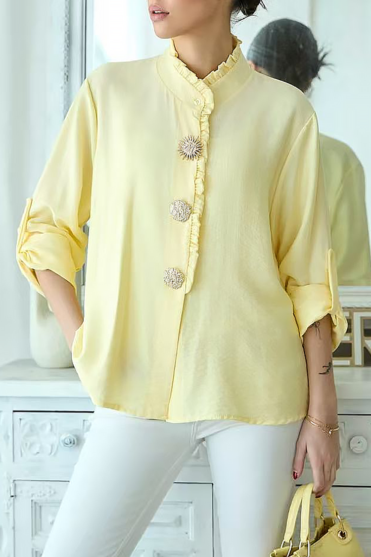 - A modell hosszú, felhajtható ujjal, látványos gallérral és gombokkal rendelkezik.