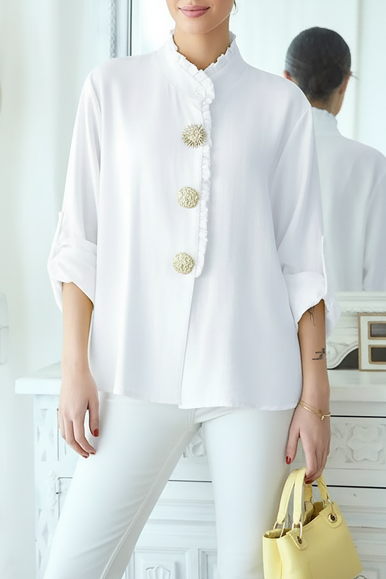 - A modell hosszú, felhajtható ujjal, látványos gallérral és gombokkal rendelkezik.