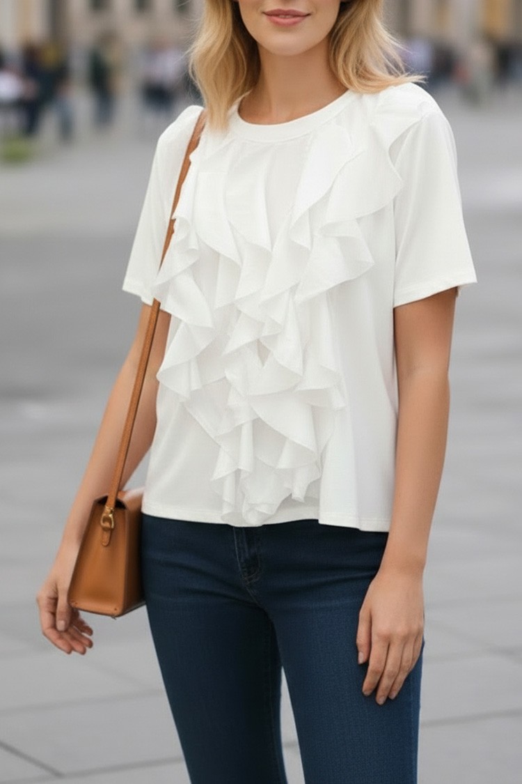 - A modell rövid ujjú, kerek nyakkivágású és kényelmes szabású.