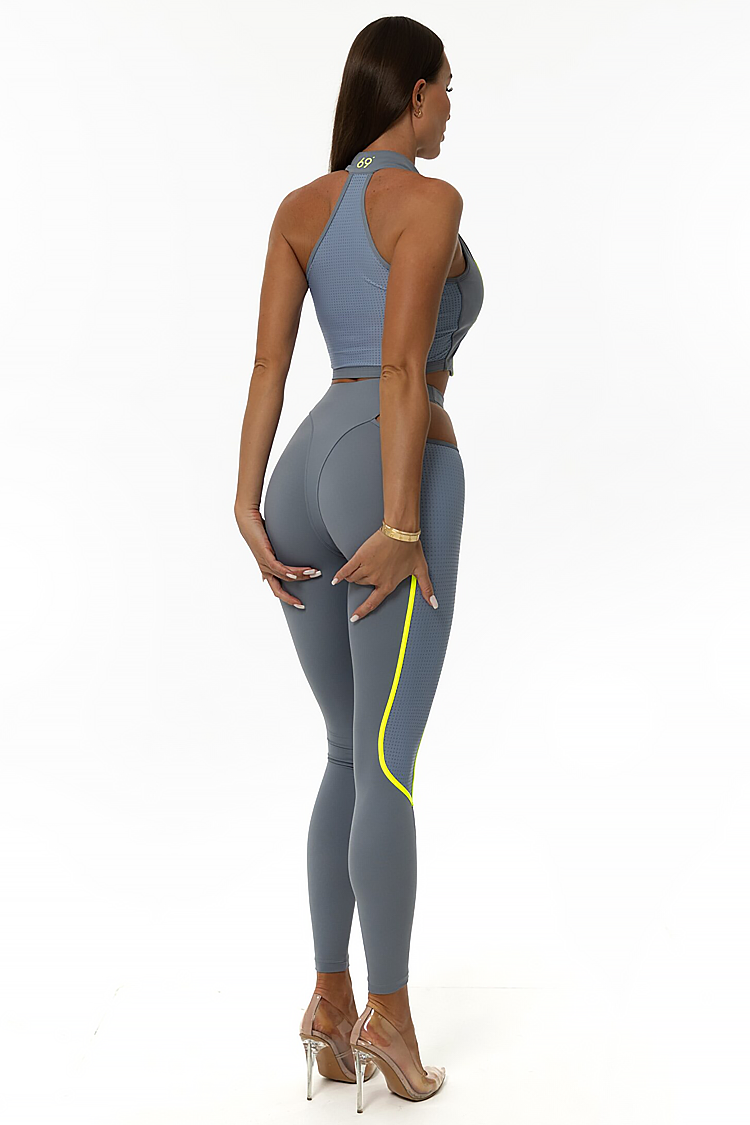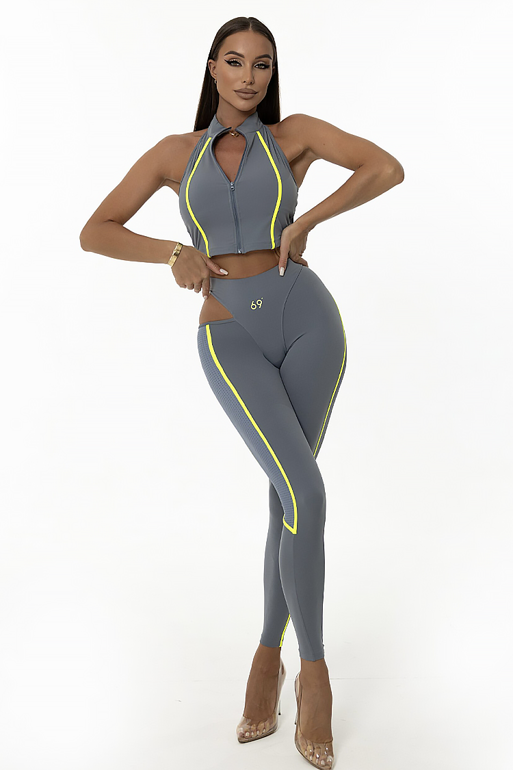 - A felső testhezálló, crop-top szabású és cipzáras, a leggings pedig magas derekú és testhezálló szabású.