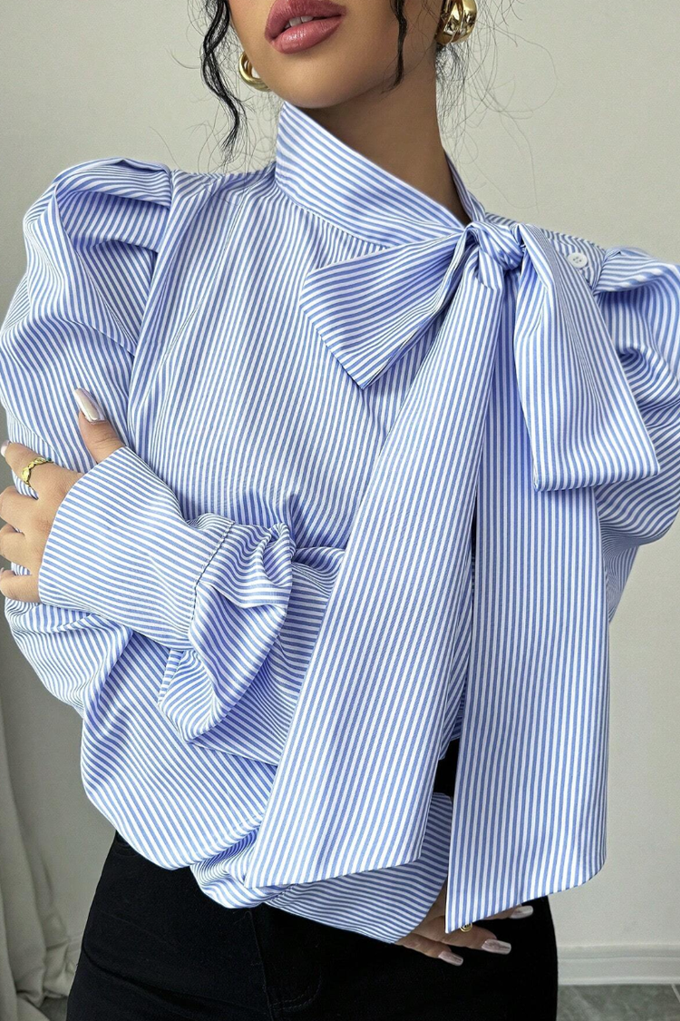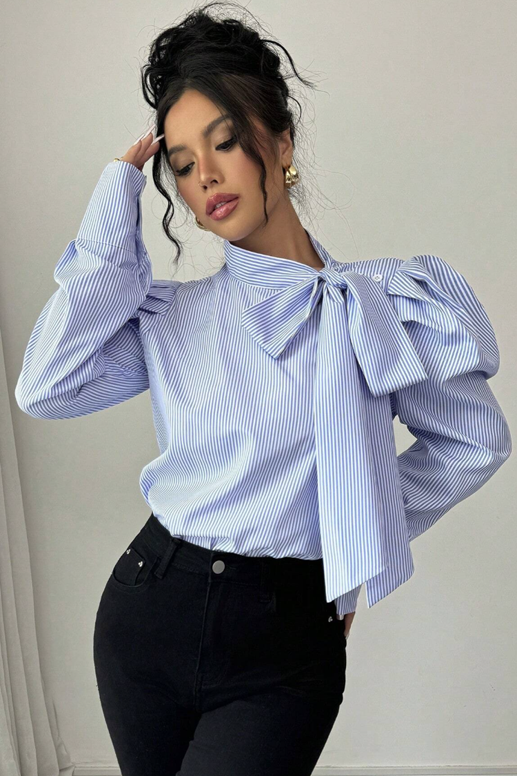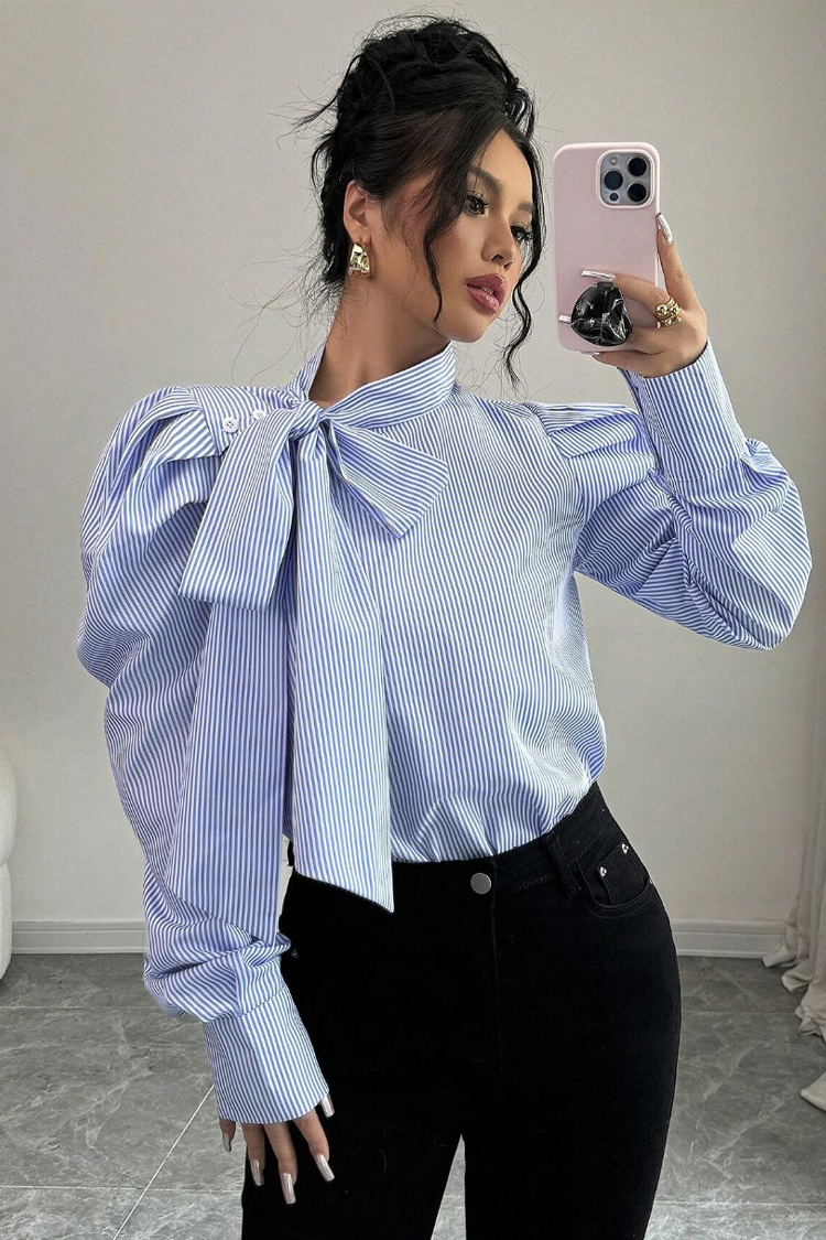 - A modell hosszú ujjú, látványos dizájnnal, szalaggal és csíkos mintával rendelkezik.
