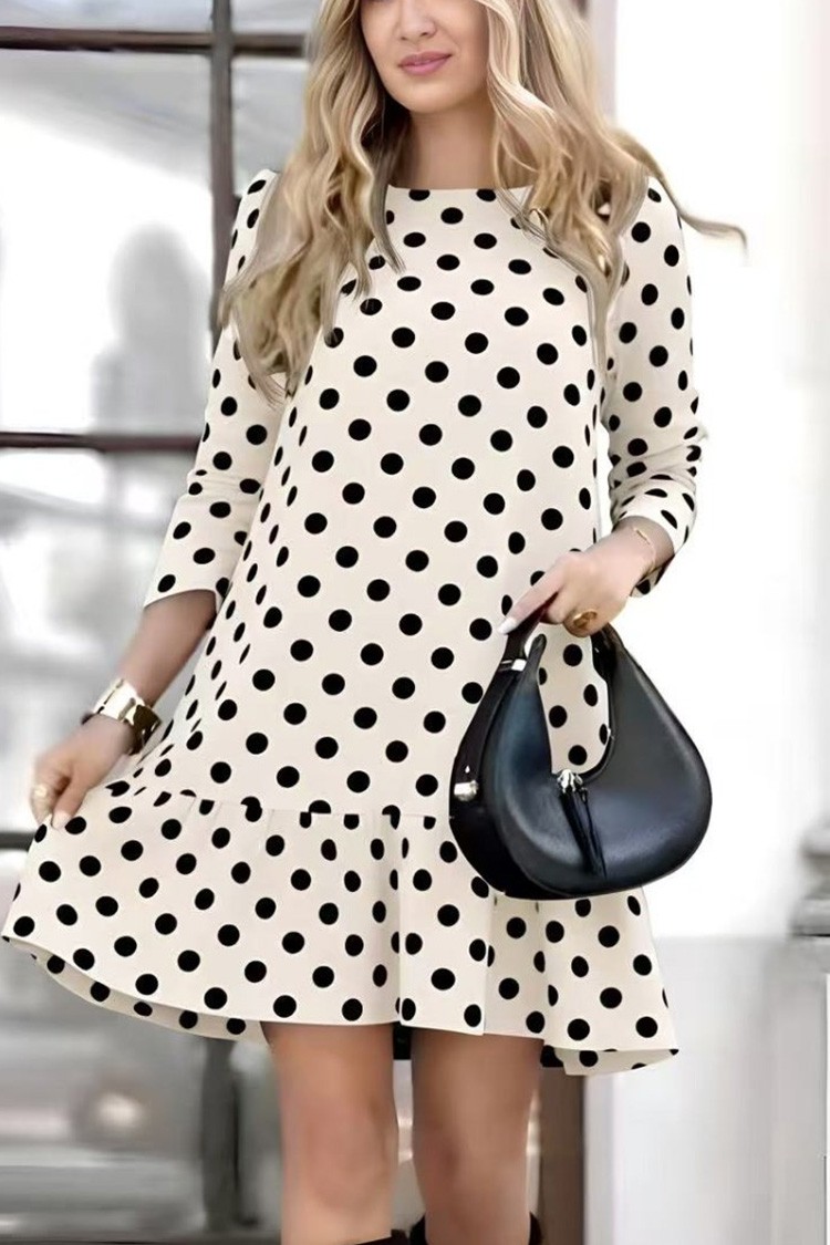 - A ruha ¾-es ujjú, bő szabású, rövid fazonú és pöttyös mintázatú.