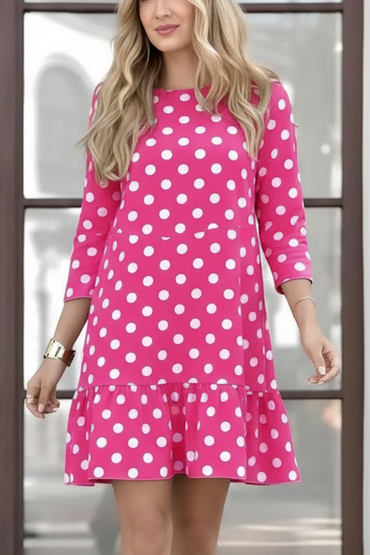 - A ruha ¾-es ujjú, bő szabású, rövid fazonú és pöttyös mintázatú.